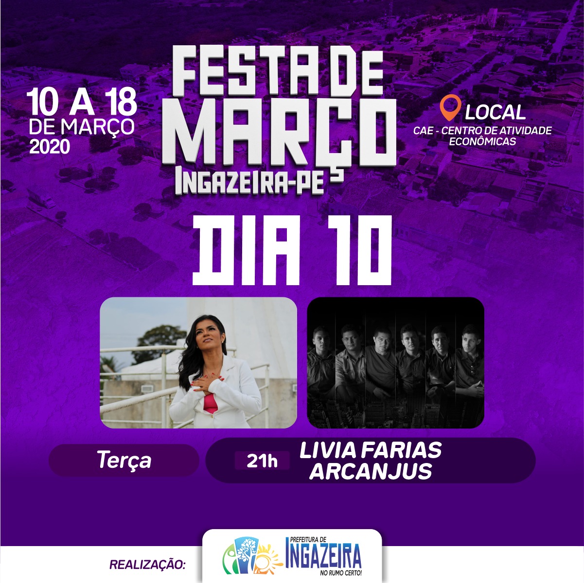 A festa do Padroeiro da cidade da Ingazeira, terá início no dia 10/03/2020 com a Celebração Eucarística às 19:00 horas marcando o início da comemoração dos seus 200 anos, após a celebração haverá quermesses, bingos e um grande Show Católico que terá início as 21:00 horas com a presença da cantora Lívia Farias e do Grupo Arcanjus, onde o mesmo será realizado no Centro de Atividades Econômicas da cidade da Ingazeira, a entrada é franca. Venha você e toda sua família participar e contribuir com a nossa comunidade.