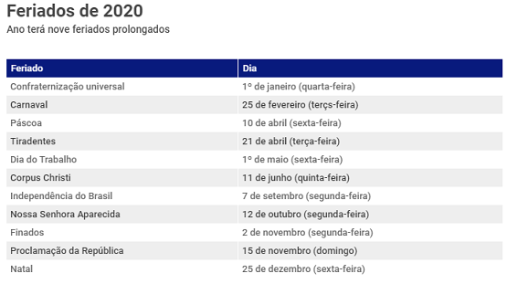 O ano de 2019 tem apenas mais um feriado nacional pela frente: o Natal. Mas, em 2020 o brasileiro terá nove feriados prolongados. É o dobro dos feriadões deste ano. O número de dias de folga pode ser ainda maior em algumas cidades, porque estados e municípios também podem decretar feriados locais. A lista oficial de feriados nacionais ainda não foi divulgada pelo Ministério da Economia.