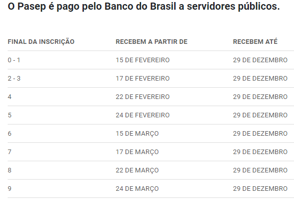 O PIS é pago pela Caixa Econômica Federal a trabalhadores do setor privado. O Pasep é pago pelo Banco do Brasil a servidores públicos. A tabela do PIS 2022 e a tabela de pagamento do PIS 2022 você confere abaixo: