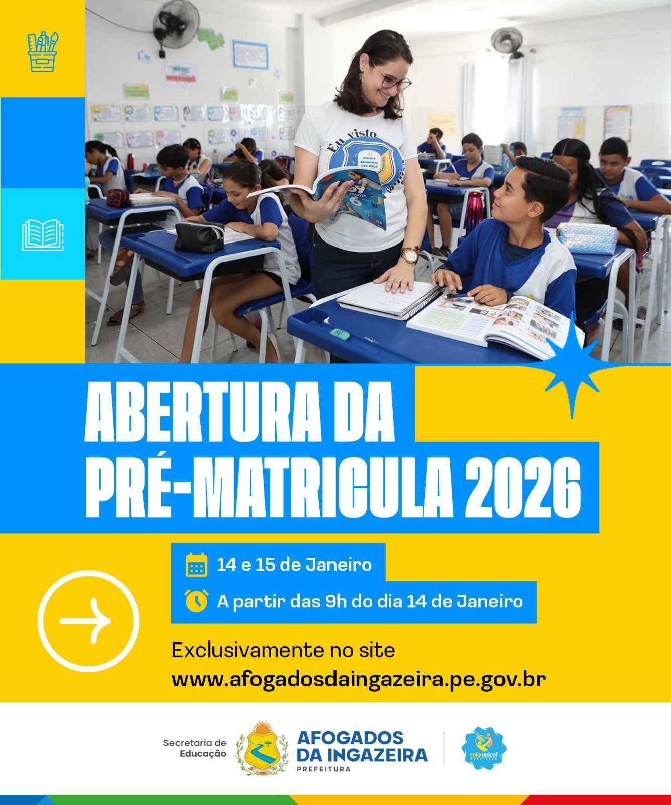 Começa nesta quarta (14), pontualmente às 9h, o processo de pré-matrículas da rede municipal de ensino de Afogados da Ingazeira. O processo tem sequência no dia 15/01, exclusivamente pelo site www.afogadosdaingazeira.pe.gov.br