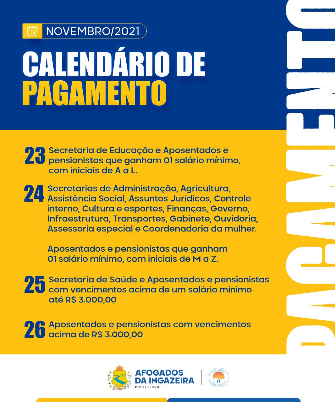 O pagamento da folha de novembro começa na próxima terça, 23 de Novembro. O décimo terceiro será pago a partir de 14 de Dezembro. E a folha de dezembro será paga a partir de 23/12.