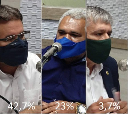 Ele tem na pesquisa estimulada, em que são oferecidas as opções para o eleitor 42,7%. O segundo colocado é o ex-presidente da Câmara e candidato do Podemos, José Negão, que aparece com 23% dos votos.
