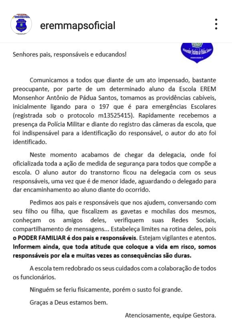 Ainda diz que os pais devem acompanhar seus filhos. “O poder familiar é dos pais e responsáveis”, afirmou em rede. Especula-se que o estudante será expulso do educandário. Ele já se envolveu em pelo menos outro caso de repercussão quando estudante de outra escola.