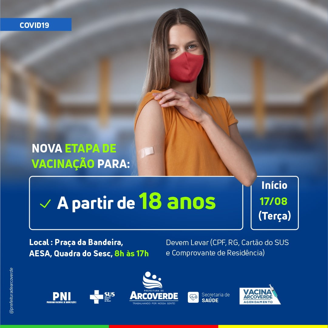 A Prefeitura de Arcoverde, através da Secretaria de Saúde e do PNI Municipal, inicia nesta terça-feira (17/08), a nova etapa de vacinação da primeira dose contra a Covid-19, para quem tem a partir de 18 anos, sem comorbidades.