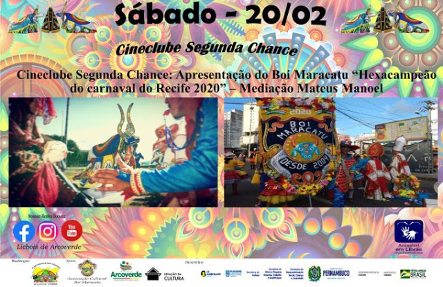 Este fim de semana está arretado de bom com várias apresentações artísticas, oficinas e cineclube “Segunda Chance” em nossa II edição mostra exposição boi maracatu mantendo a tradição de forma remota e disponibilizando acessibilidade para surdos e ensurdecidos. As Lives ficarão disponíveis sempre a partir das 19h00 nos canais oficiais da LICBOIS de Arcoverde (Facebook, Instagram e Youtube), não se esqueçam de curtir, comentar e compartilhar.