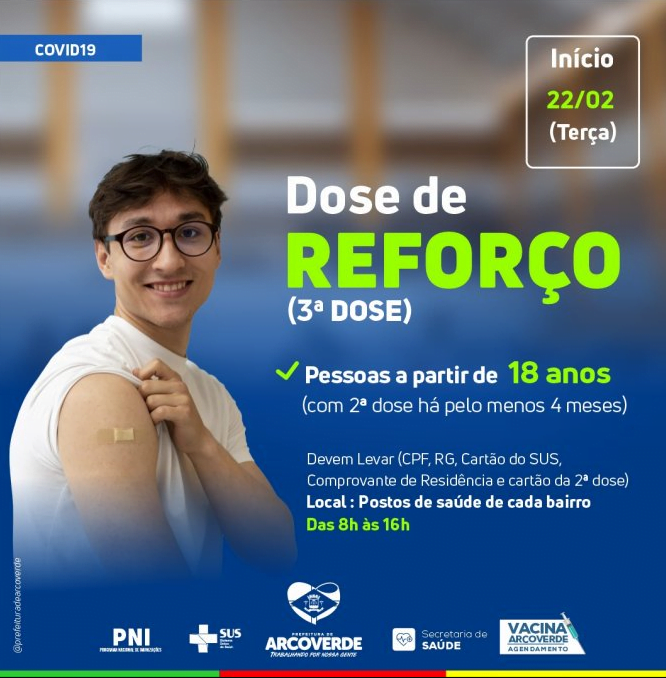 A Secretaria de Saúde de Arcoverde e o PNI Municipal estão abrindo nesta terça-feira, 22 de fevereiro, a etapa da dose de reforço (ou terceira dose) contra a Covid-19, em todas as imunizações, para quem tem 18 anos ou mais e recebeu a segunda dose ou dose única há quatro meses.
