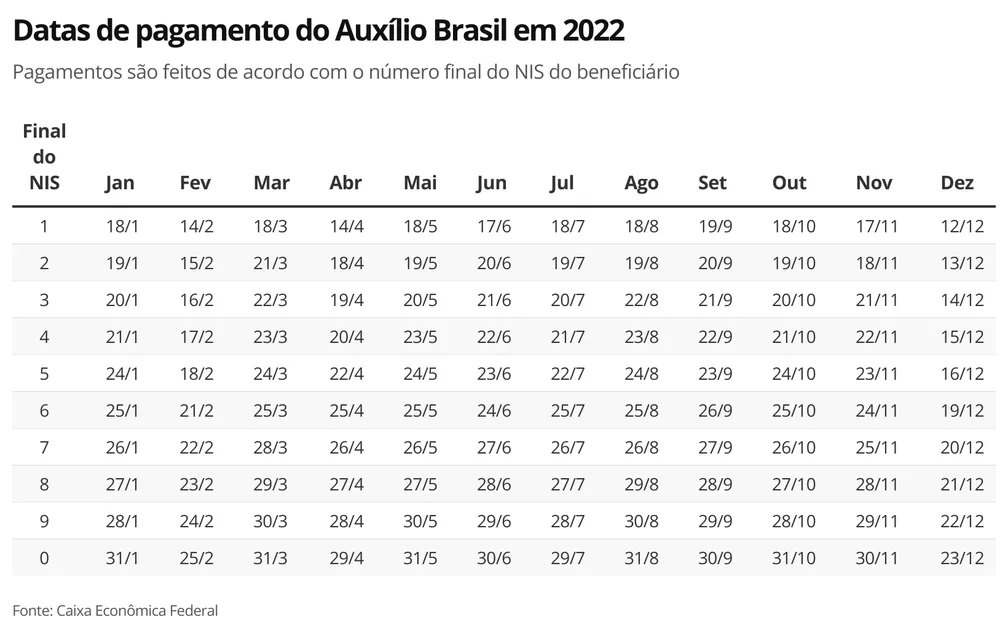 Começa nesta segunda-feira (18), o pagamento das parcelas de julho do Auxílio Brasil. A liberação das verbas é feita de acordo com a numeração final do Número de Identificação Social (NIS) do beneficiário, seguindo o calendário abaixo:
