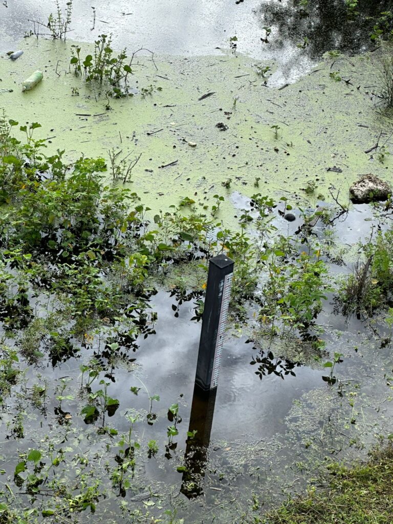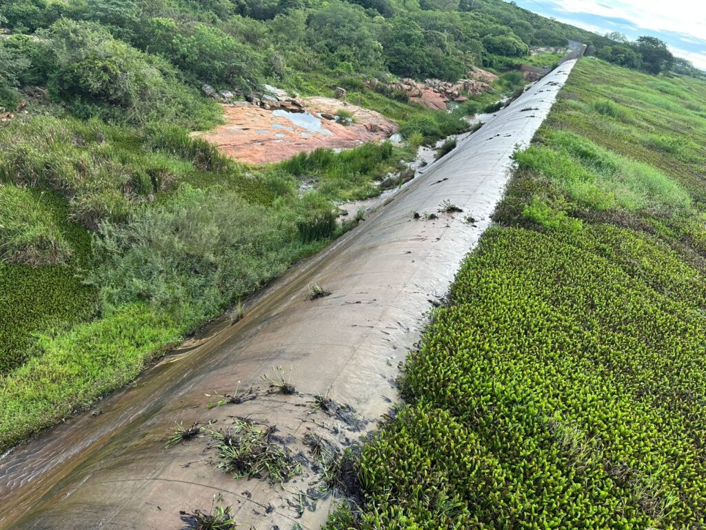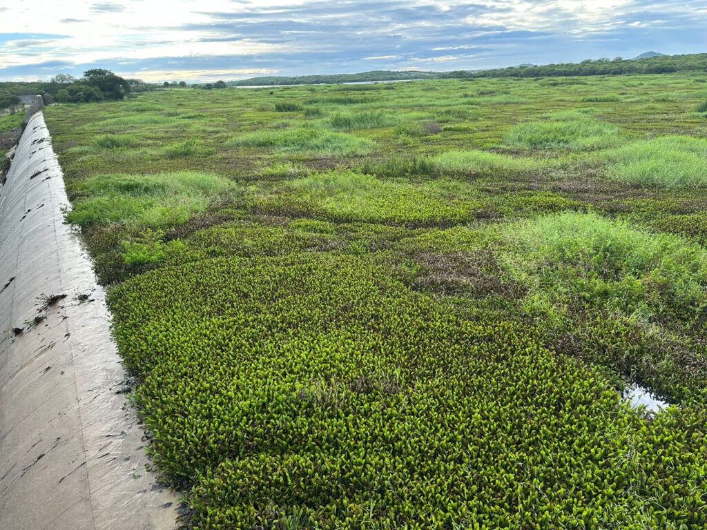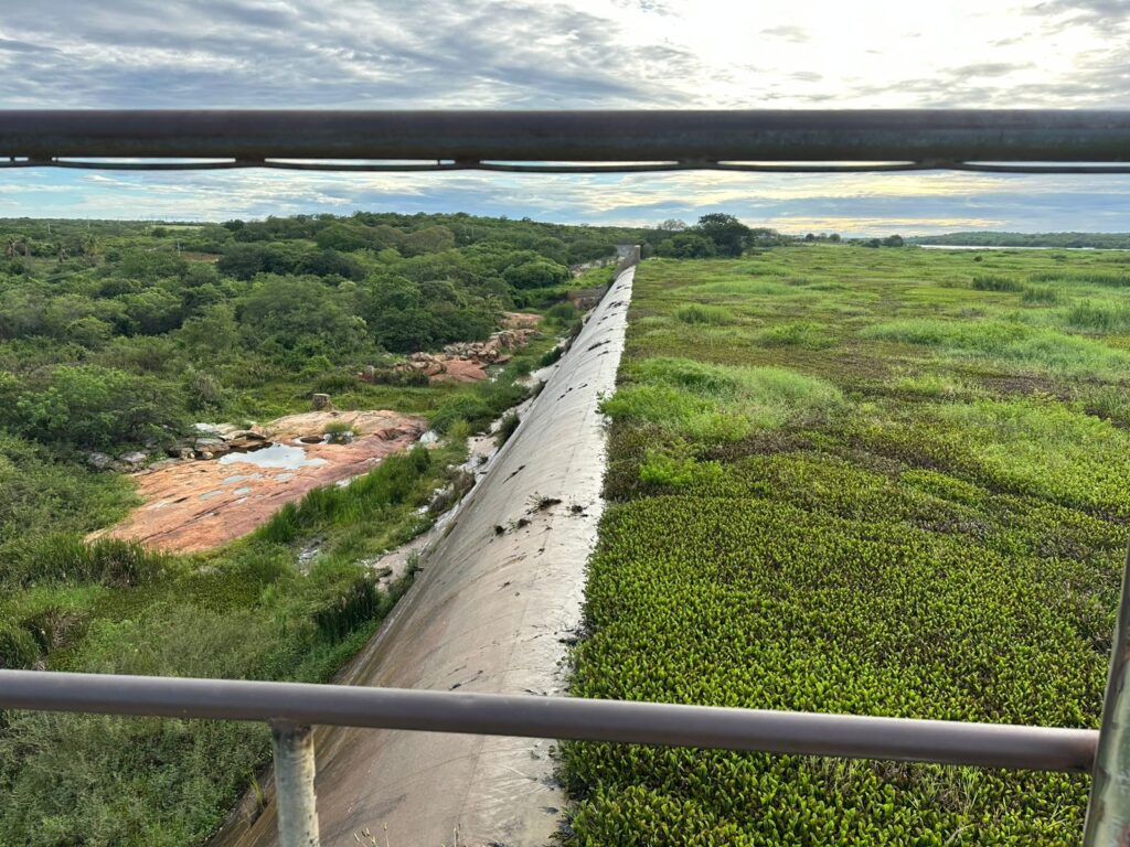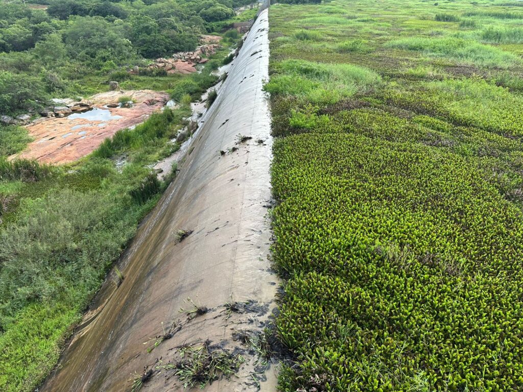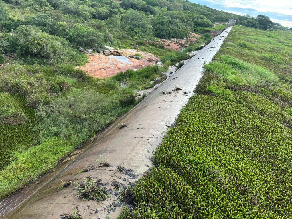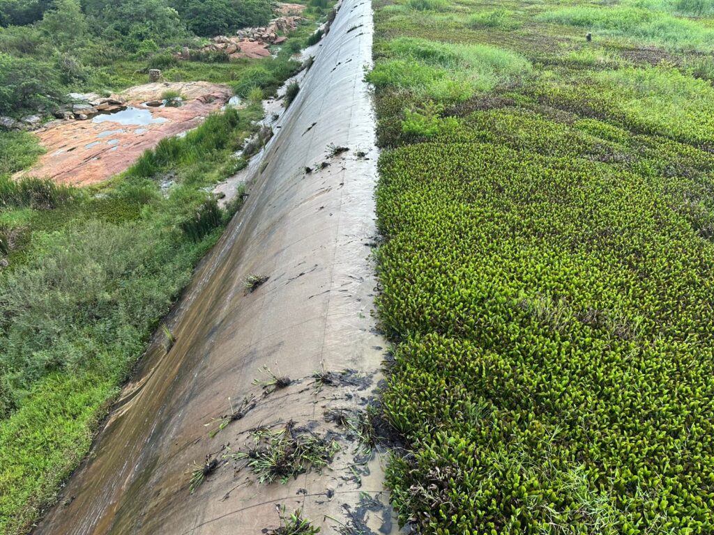 A altura da água que escorre pelo vertedouro não é mais intensa devido à presença de plantas aquáticas na superfície.