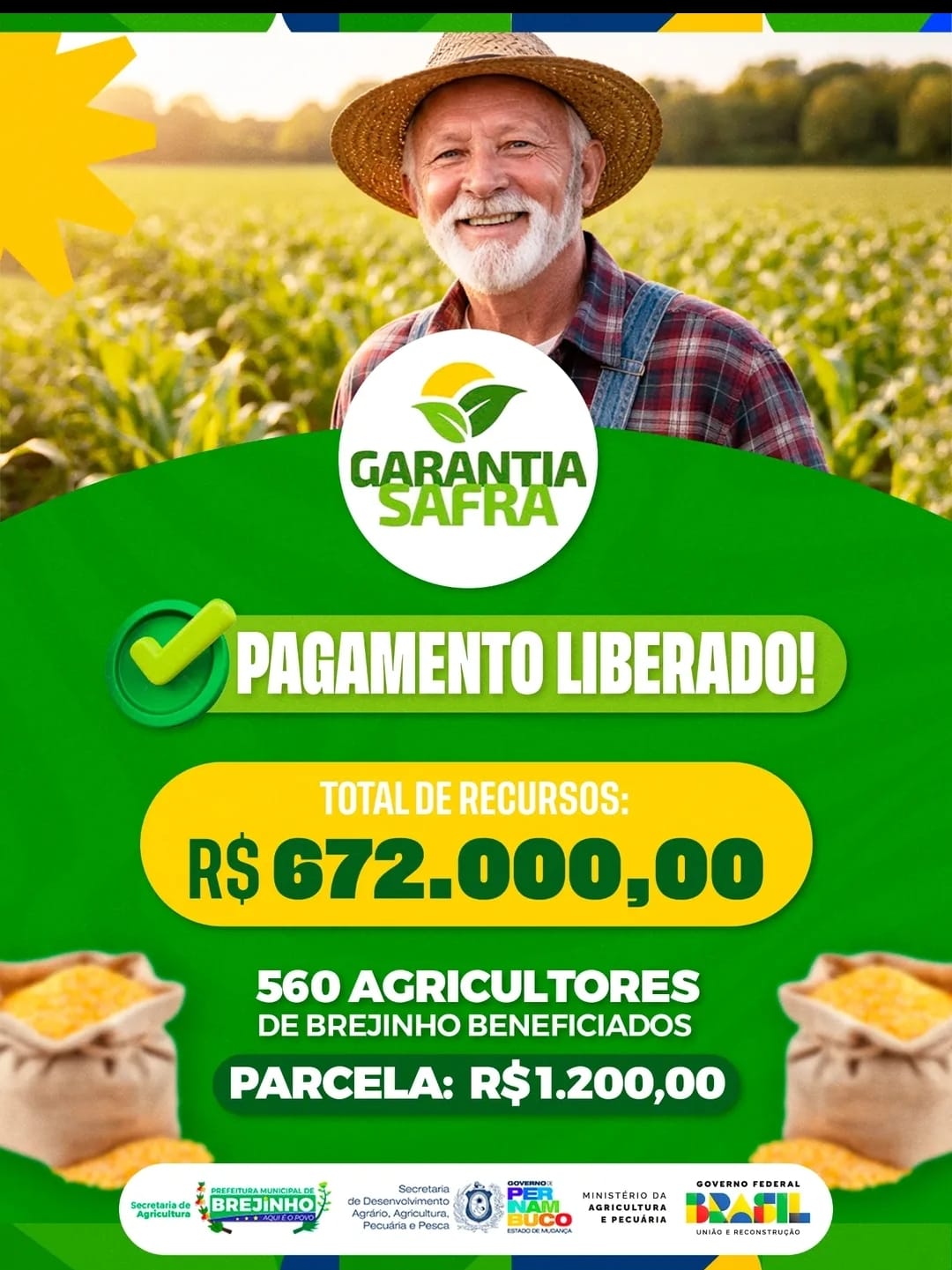 A Prefeitura de Brejinho anunciou o pagamento do Garantia Safra para 560 agricultores do município, trazendo um importante reforço para a economia local e para as famílias do campo. O anúncio foi feito por meio das redes sociais oficiais da gestão municipal.