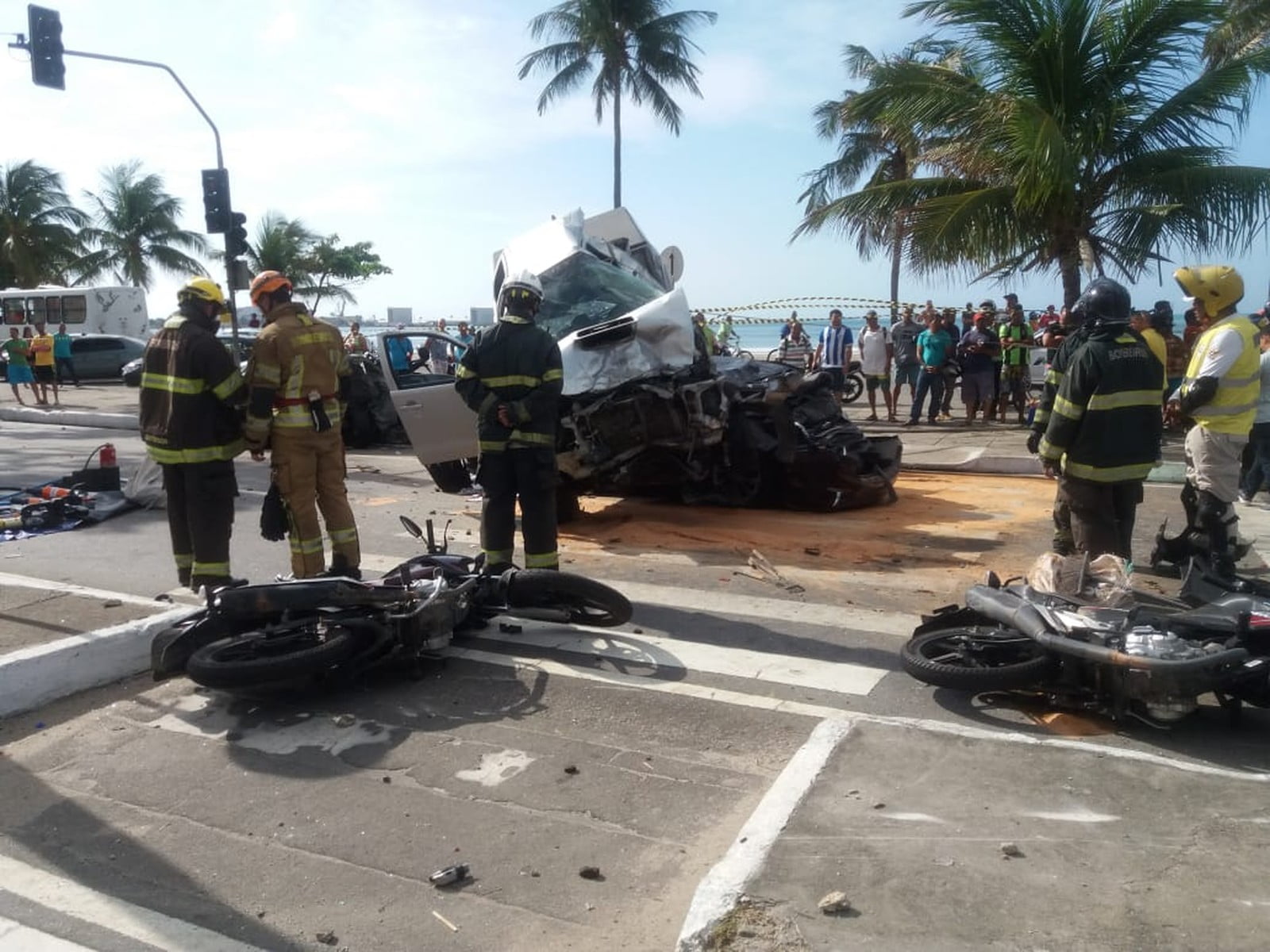 Uma pessoa morreu e ao menos duas ficaram feridas em um grave acidente de trânsito na manhã deste sábado (20). Uma caminhonete em alta velocidade colidiu contra 2 motos e 3 carros na Av. Assis Chateaubriand, em Maceió. O impacto foi tão forte que o veículo maior ficou sobre um dos carros.