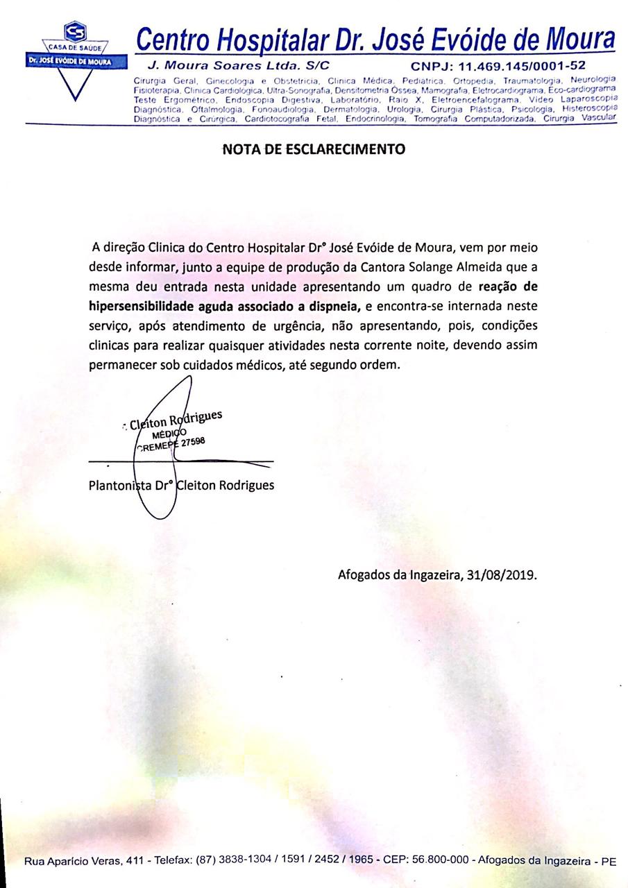 Porém a cantora passou mal e deu entrada na Casa de Saúde Dr. José Evóide de Moura em Afogados da Ingazeira apresentando reação hipersensibilidade aguda associado a dispneia.