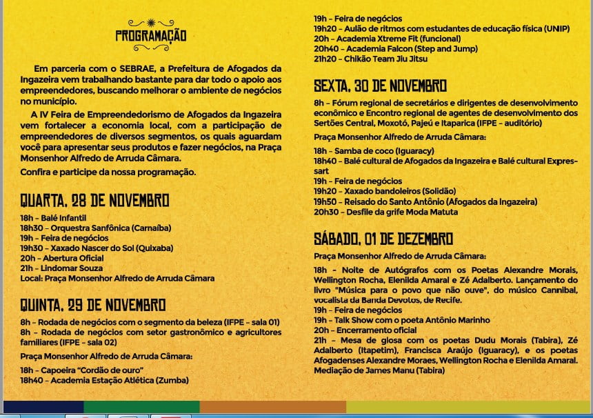 Na programação, que vai até o dia primeiro de dezembro, palestras, feira de negócios, seminários, fórum de secretários e agentes municipais de desenvolvimento, desfile de moda matuta, apresentações de coco, reisado, xaxado, mesa de glosas e poesia. O evento é promovido pela Prefeitura de Afogados em parceria com o SEBRAE, e conta com o apoio de parceiros do quilate do SESC, SENAC, CDL local, AD-Diper e Governo de Pernambuco. Este ano, segundo os organizadores, serão 117 stands, 140 empreendedores (um acréscimo de mais de 30% com relação ao ano passado) e uma perspectiva de ampliação de 20% no volume de negócios realizados.