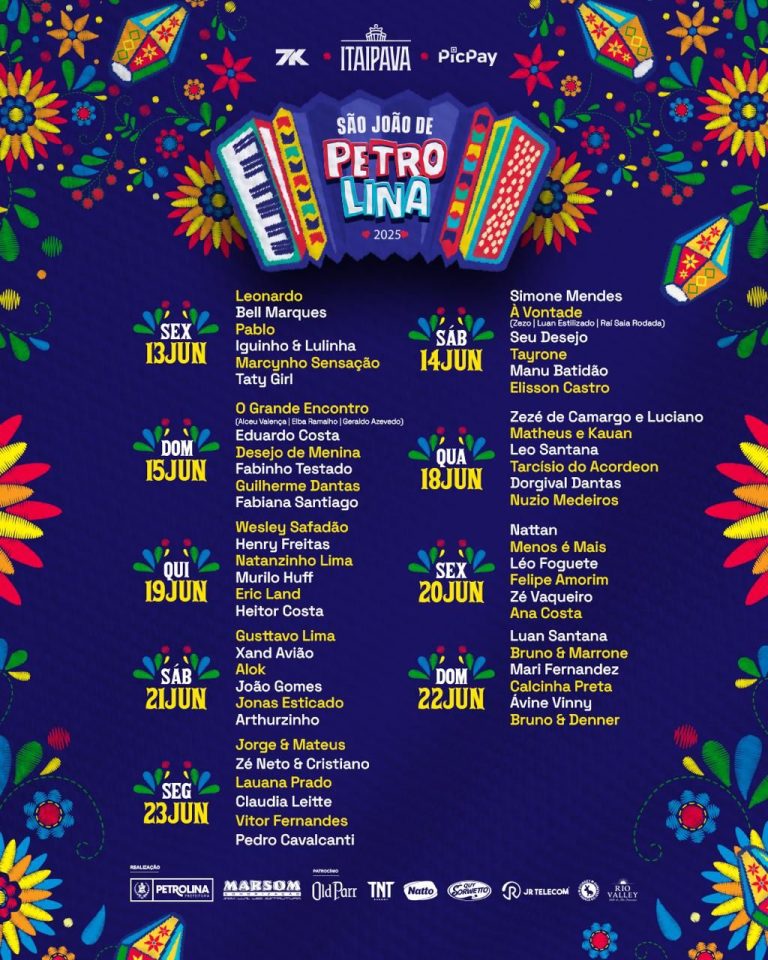 Com mais de 100 atrações musicais, o ciclo junino deve movimentar cerca de R$ 320 milhões na economia de Petrolina. A programação conta com atrações que simbolizam a cultura nordestina como Dorgival Dantas, João Gomes, Tarcisio do Acordeon e o Grande Encontro, mas também artistas de diversos segmentos musicais, a exemplo, de Gusttavo Lima, Safadão, Jorge e Mateus, Menos é Mais, Luan Santana, Natanzinho Lima, Nattan, Alok e Claudia Leite.