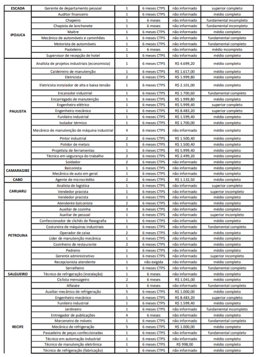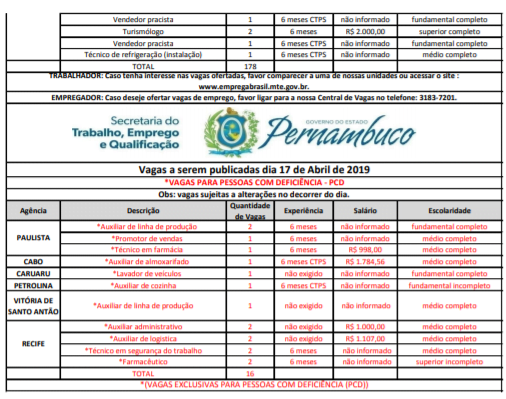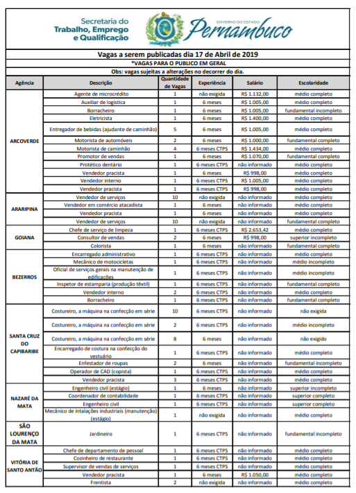 As Agências do Trabalho estão com vagas de emprego abertas para esta quarta-feira (17) em várias cidades de Pernambuco.