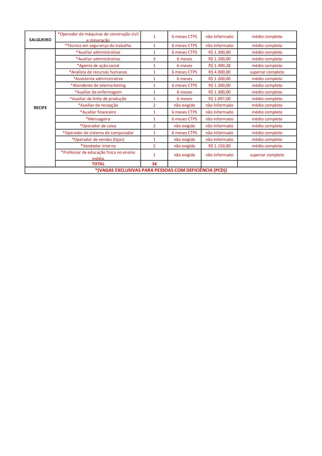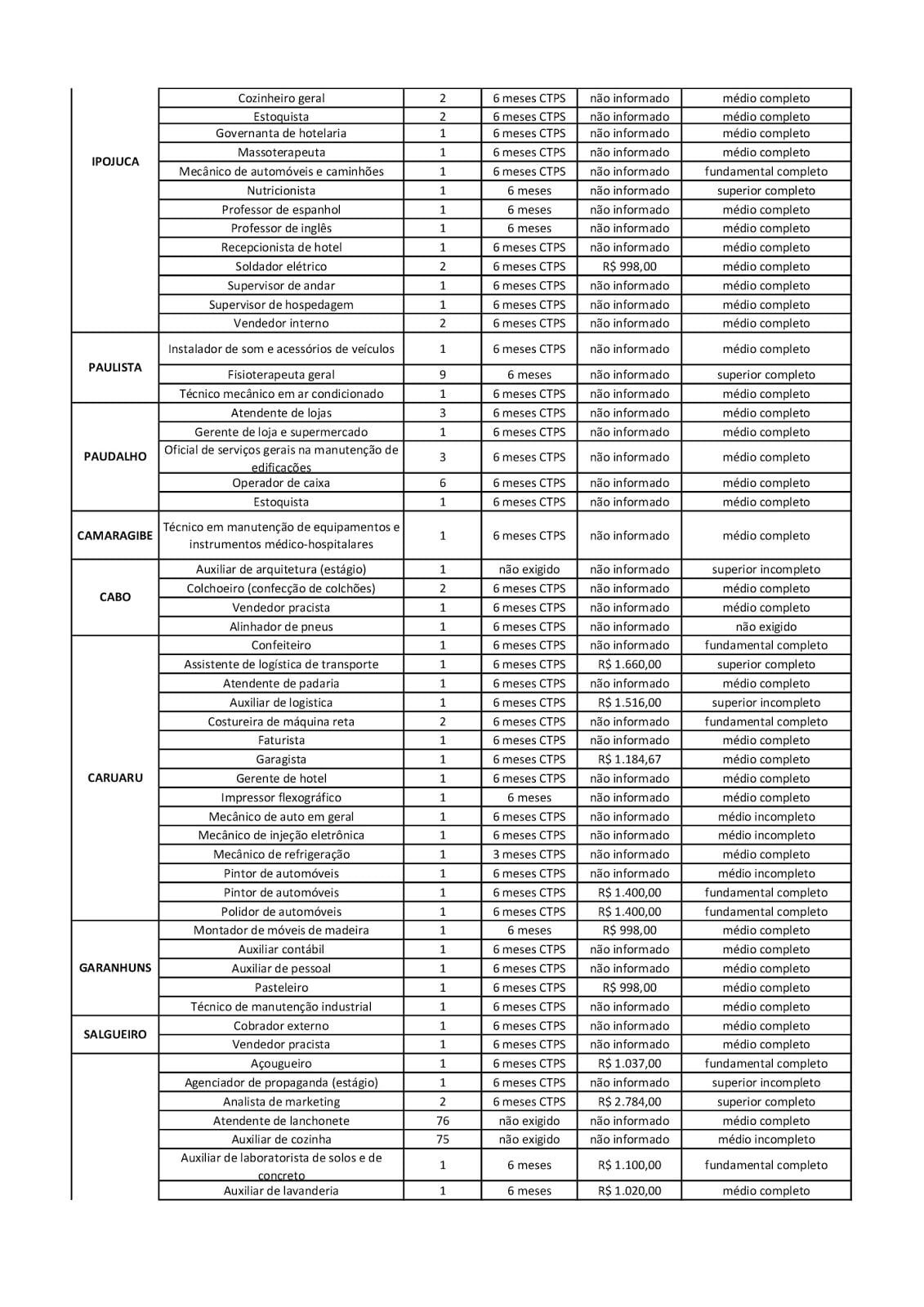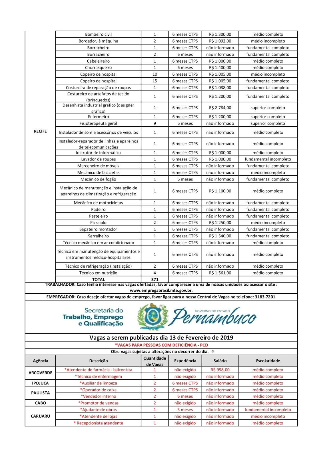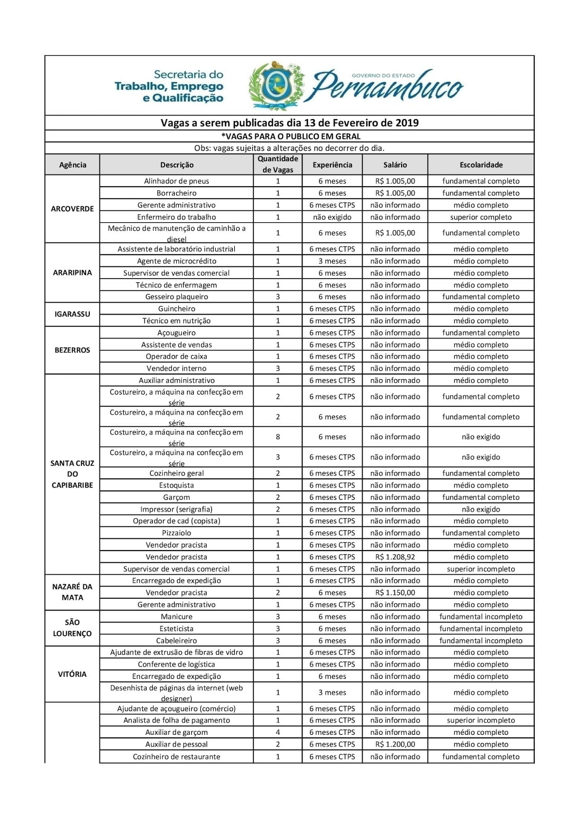 As Agências do Trabalho estão com vagas de emprego abertas para esta quarta-feira (13) em várias cidades de Pernambuco.