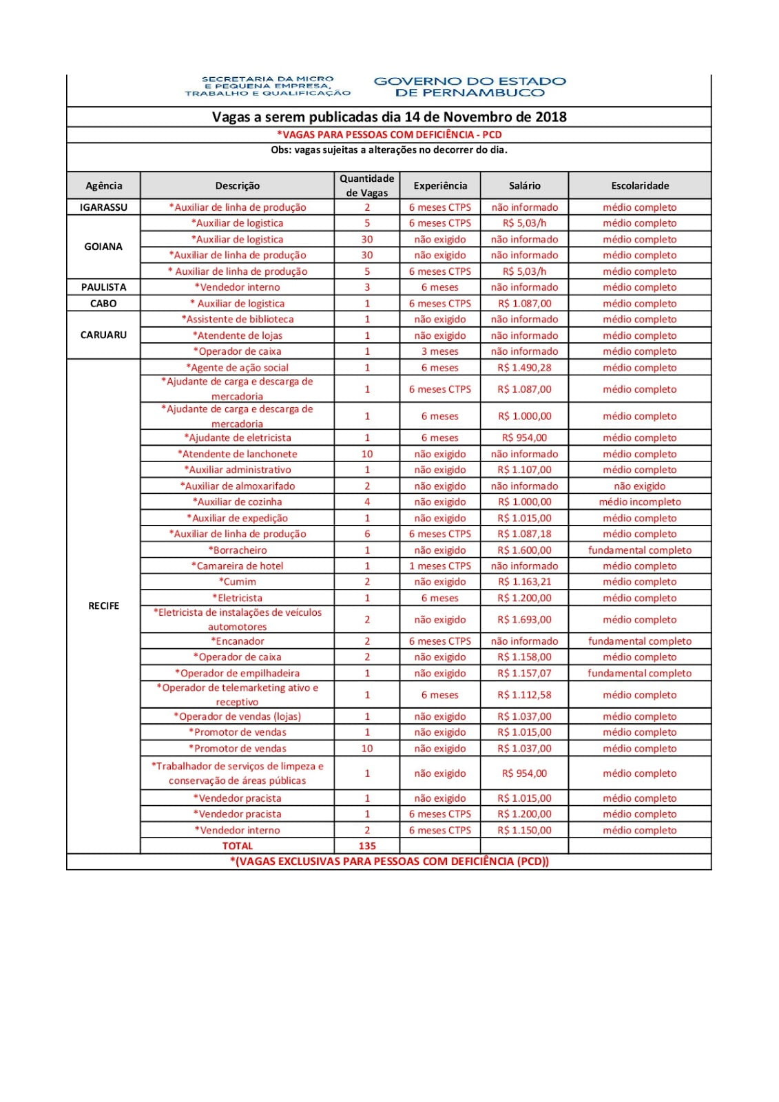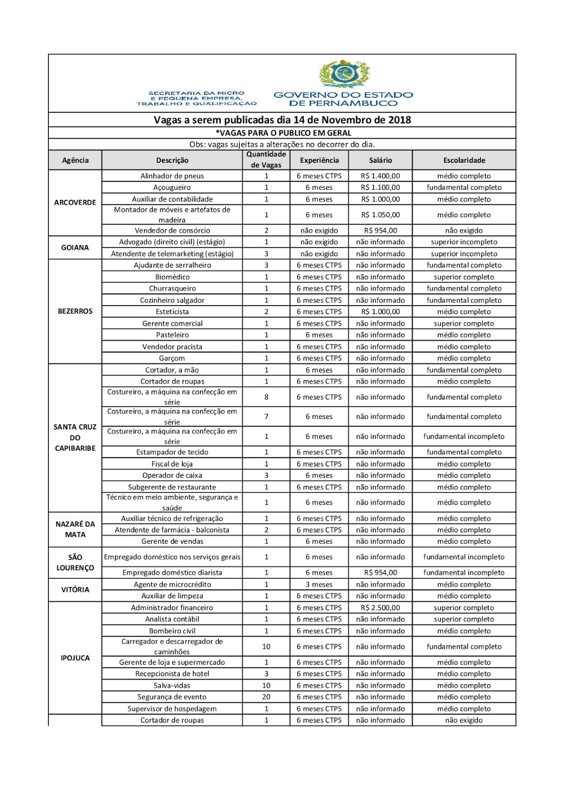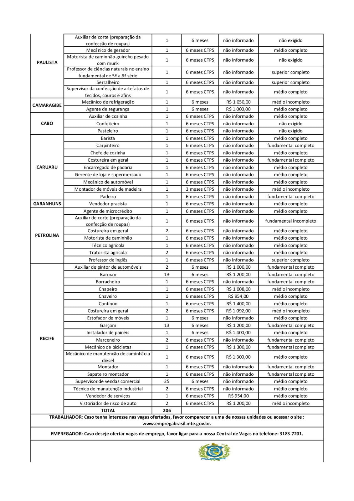 As Agências do Trabalho estão com vagas de emprego abertas para esta quarta-feira (14) em várias cidades de Pernambuco.