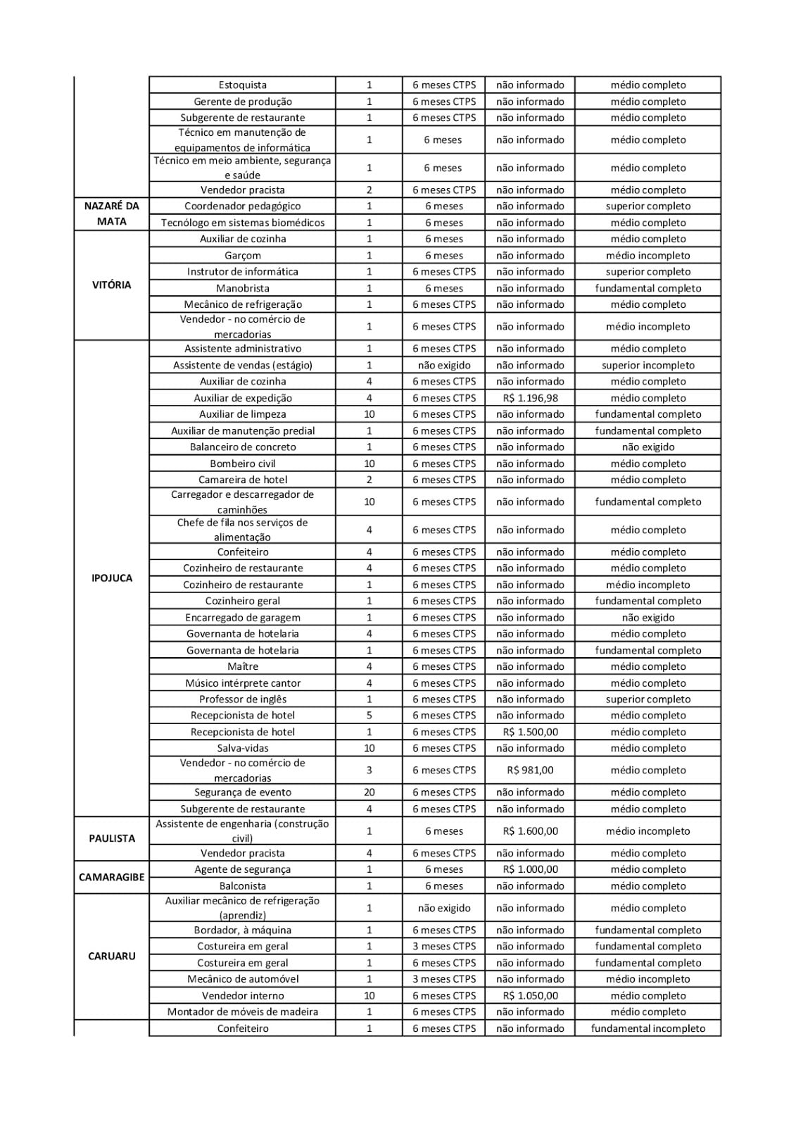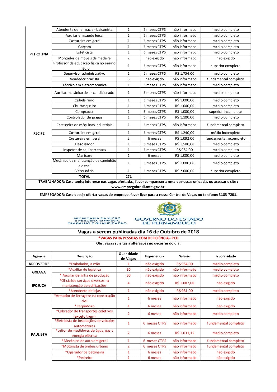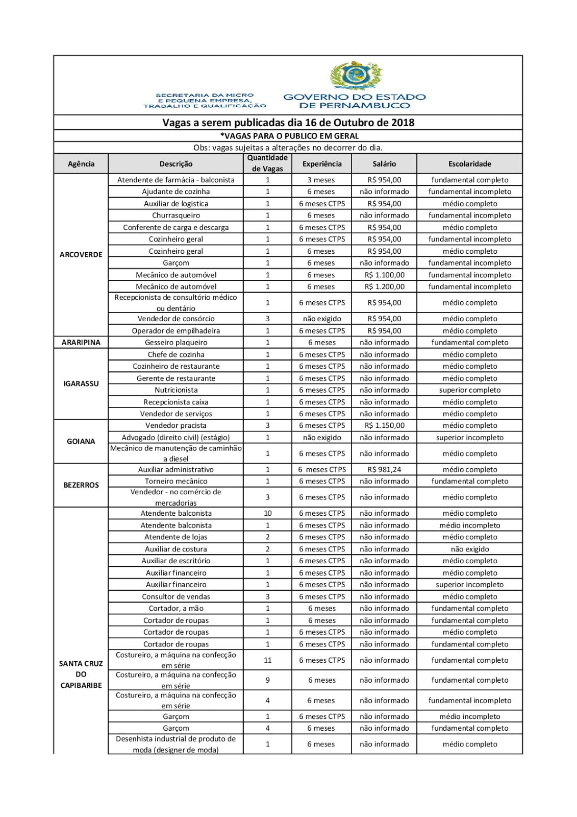 As Agências do Trabalho estão com vagas de emprego abertas para esta terça-feira (16) em várias cidades de Pernambuco.