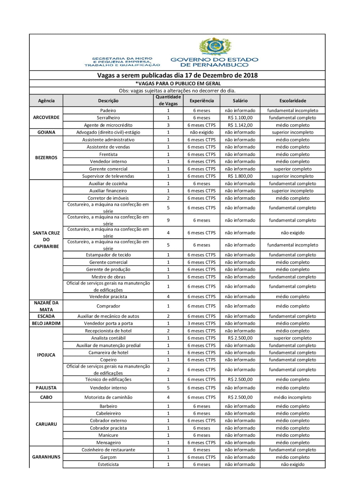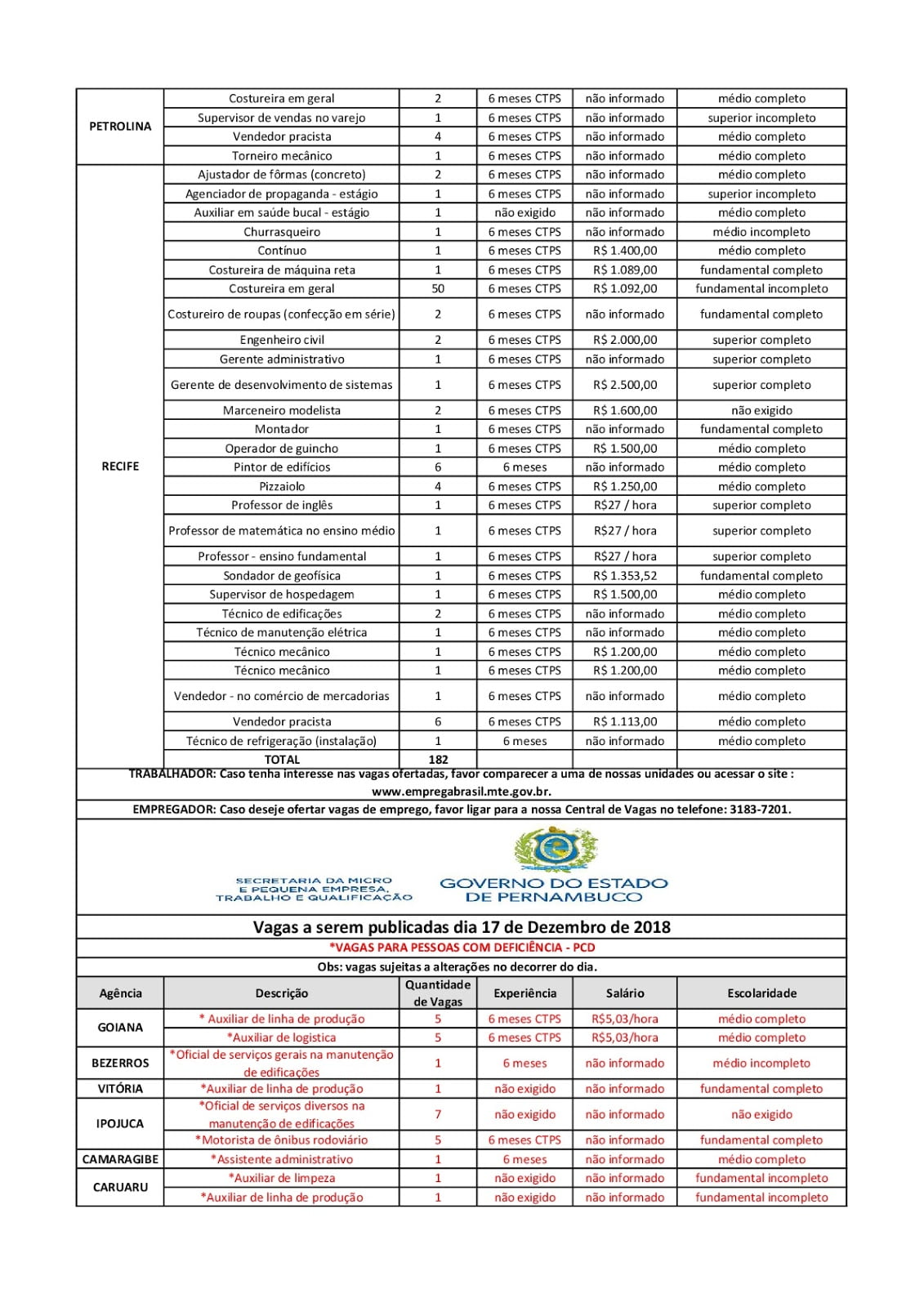As Agências do Trabalho estão com vagas de emprego abertas para esta segunda-feira (17) em várias cidades de Pernambuco.