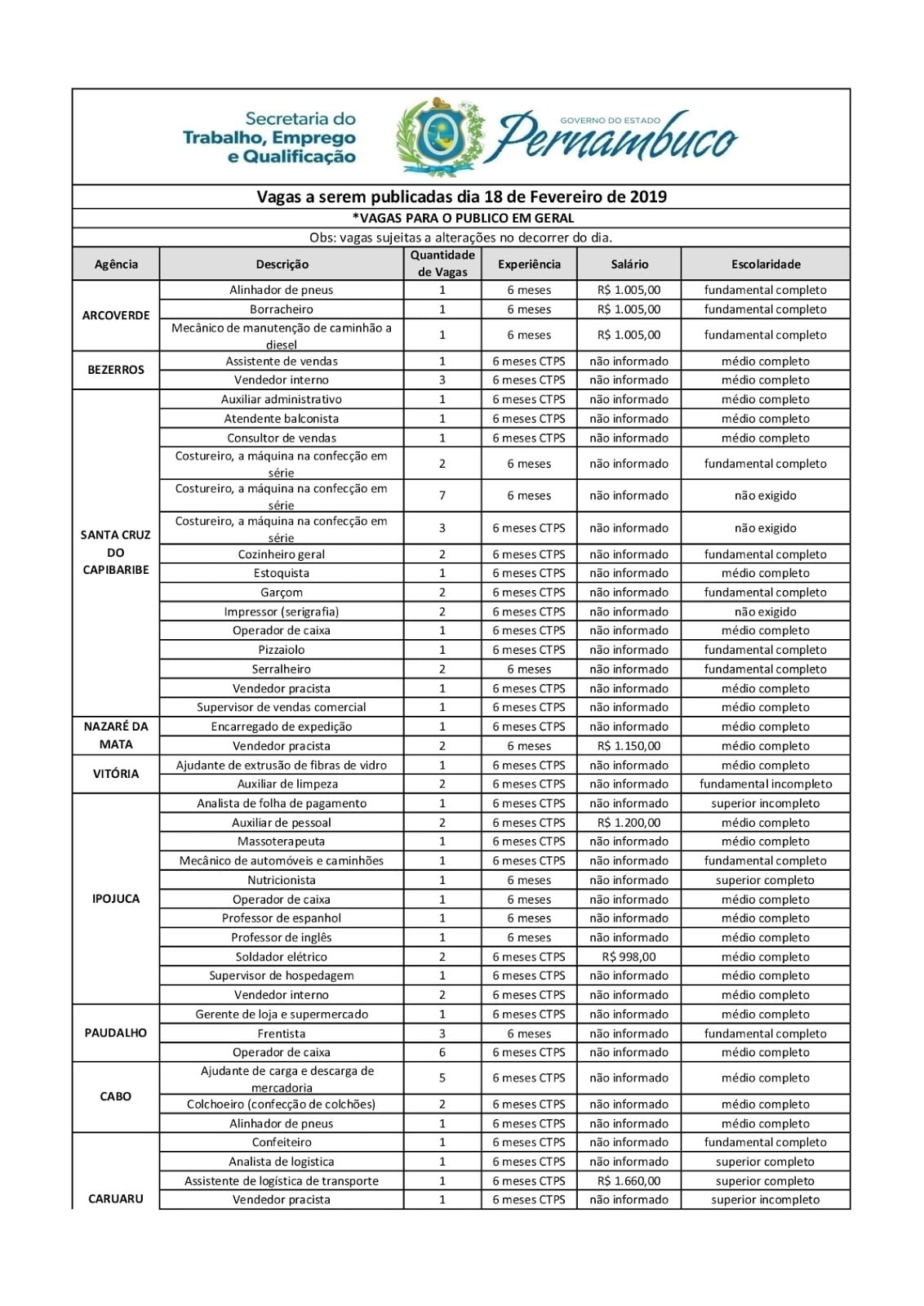 As Agências do Trabalho estão com vagas de emprego abertas para esta segunda-feira (18) em várias cidades de Pernambuco.