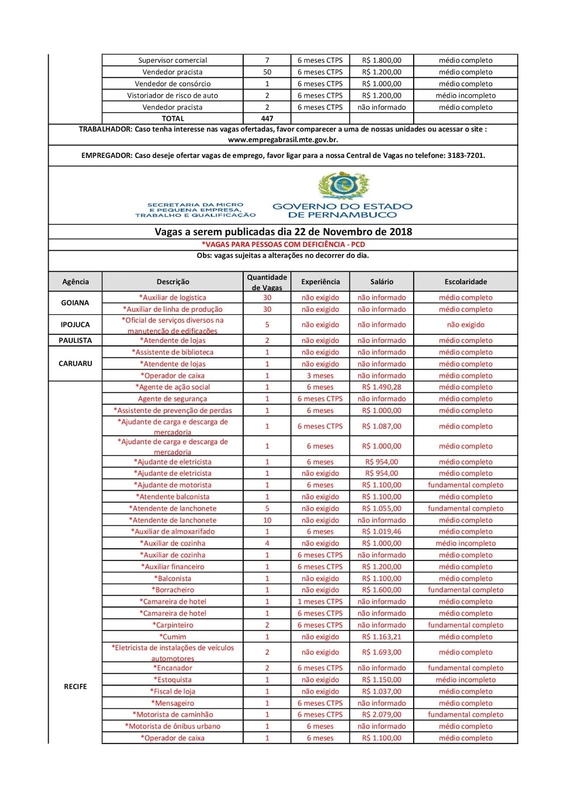 As Agências do Trabalho estão com vagas de emprego abertas para esta sexta-feira (23) em várias cidades de Pernambuco.