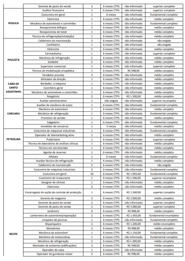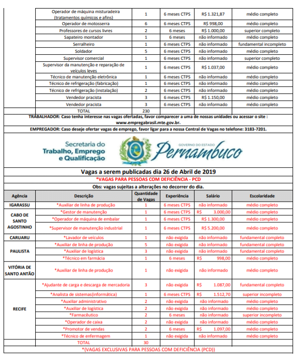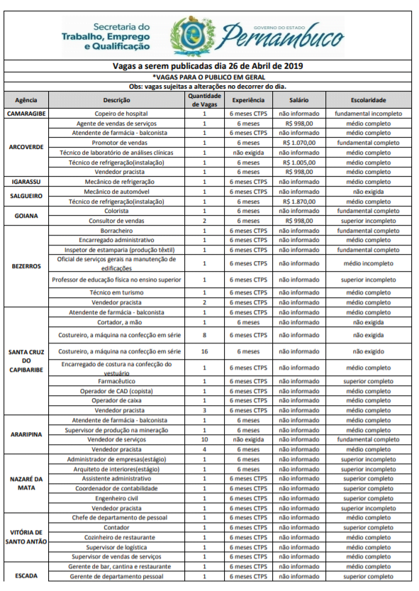 As Agências do Trabalho estão com vagas de emprego abertas para esta sexta-feira (26) em várias cidades de Pernambuco.