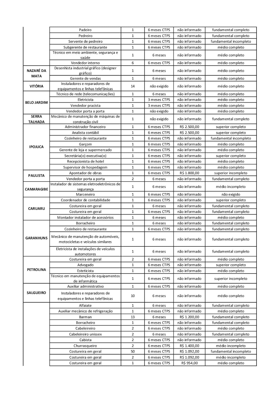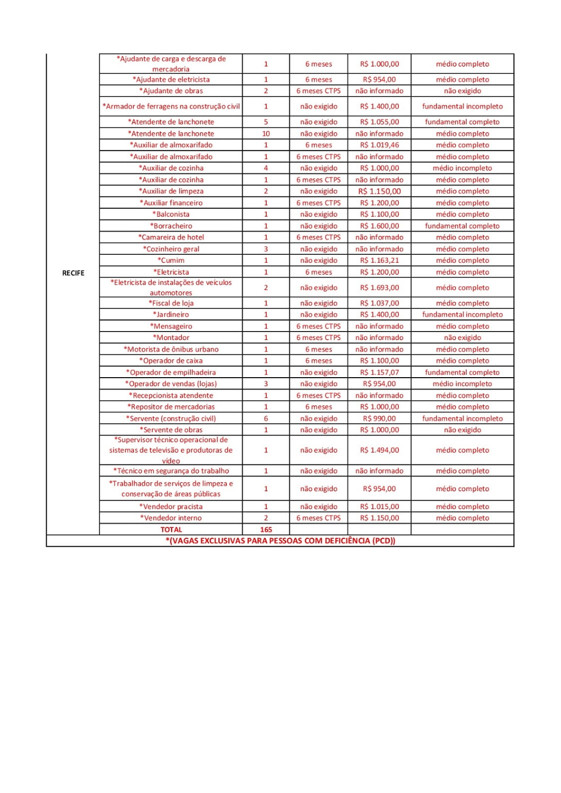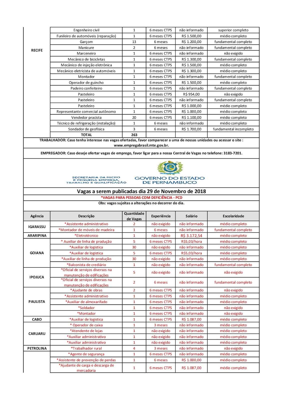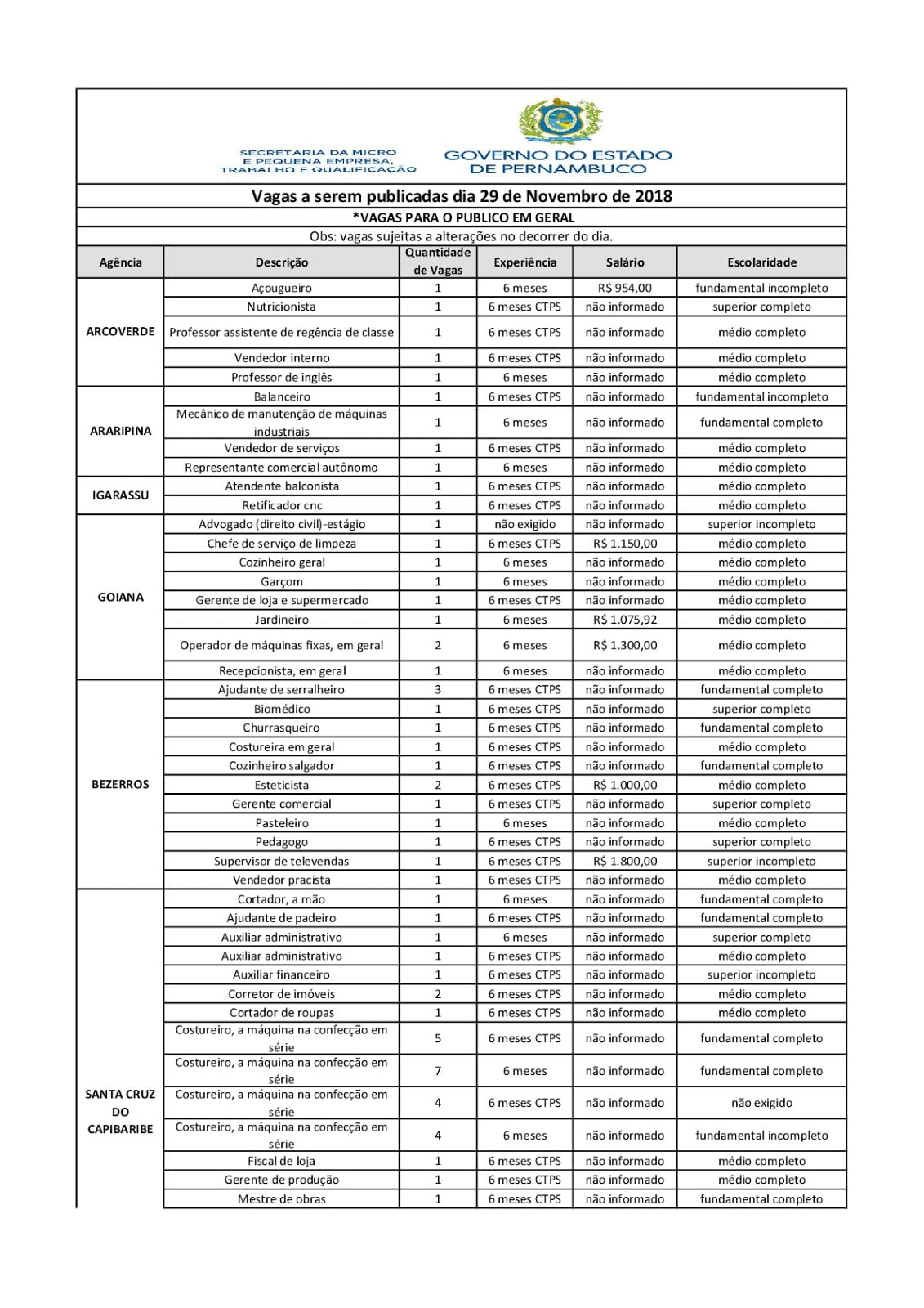 As Agências do Trabalho estão com vagas de emprego abertas para esta quinta-feira (29) em várias cidades de Pernambuco.