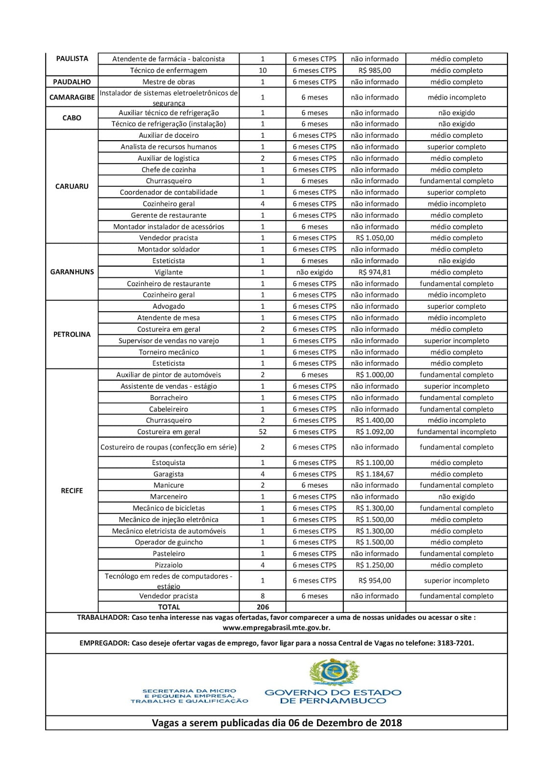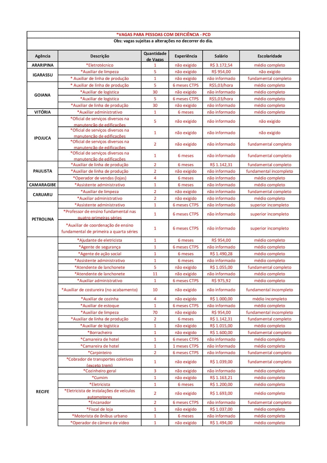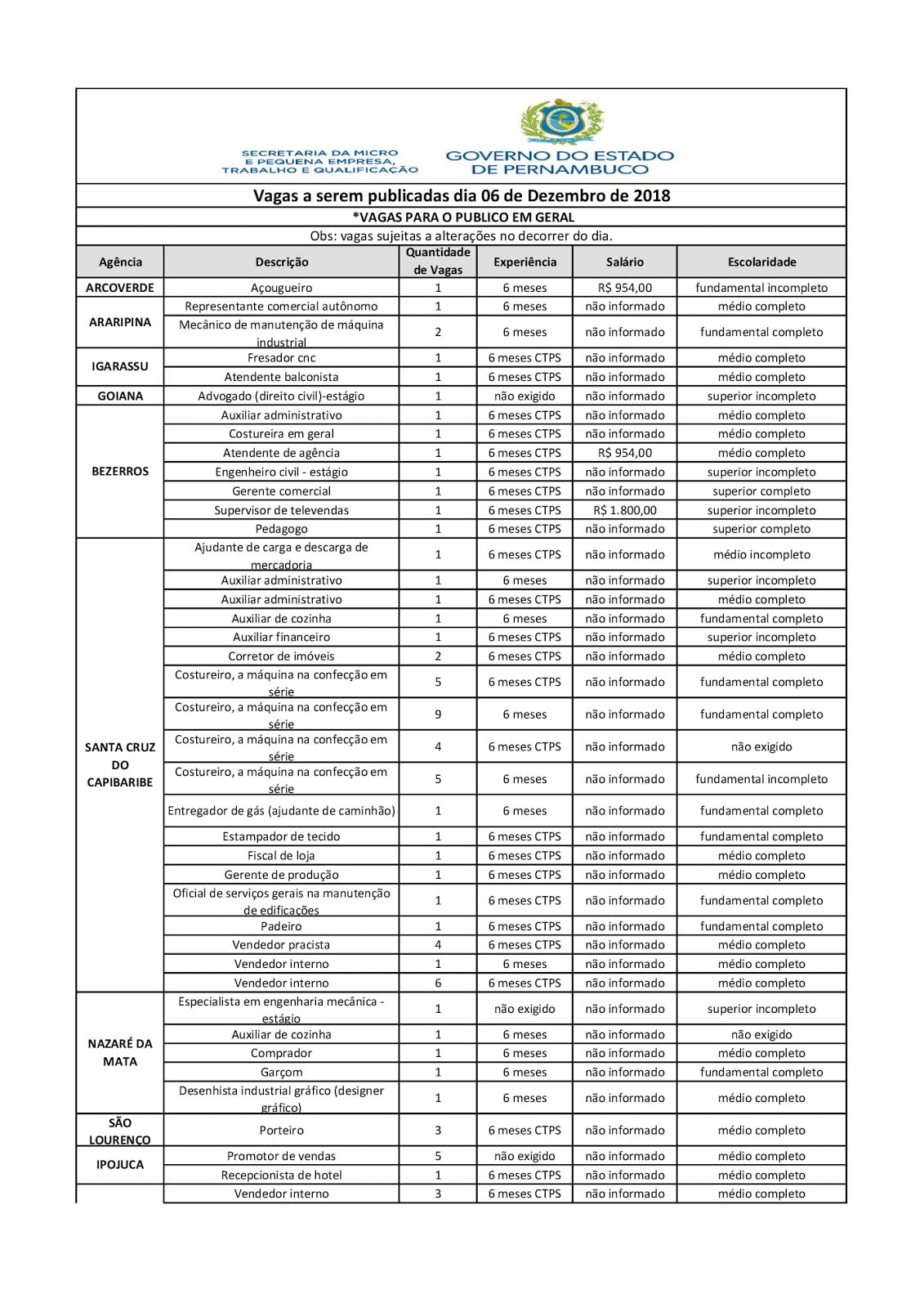 As Agências do Trabalho estão com vagas de emprego abertas para esta quinta-feira (06) em várias cidades de Pernambuco.