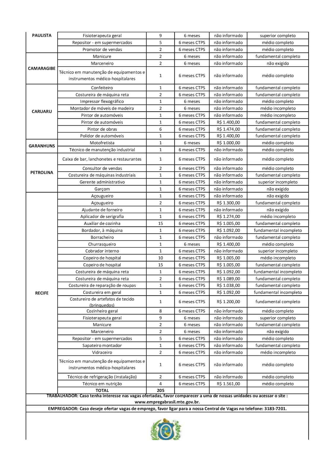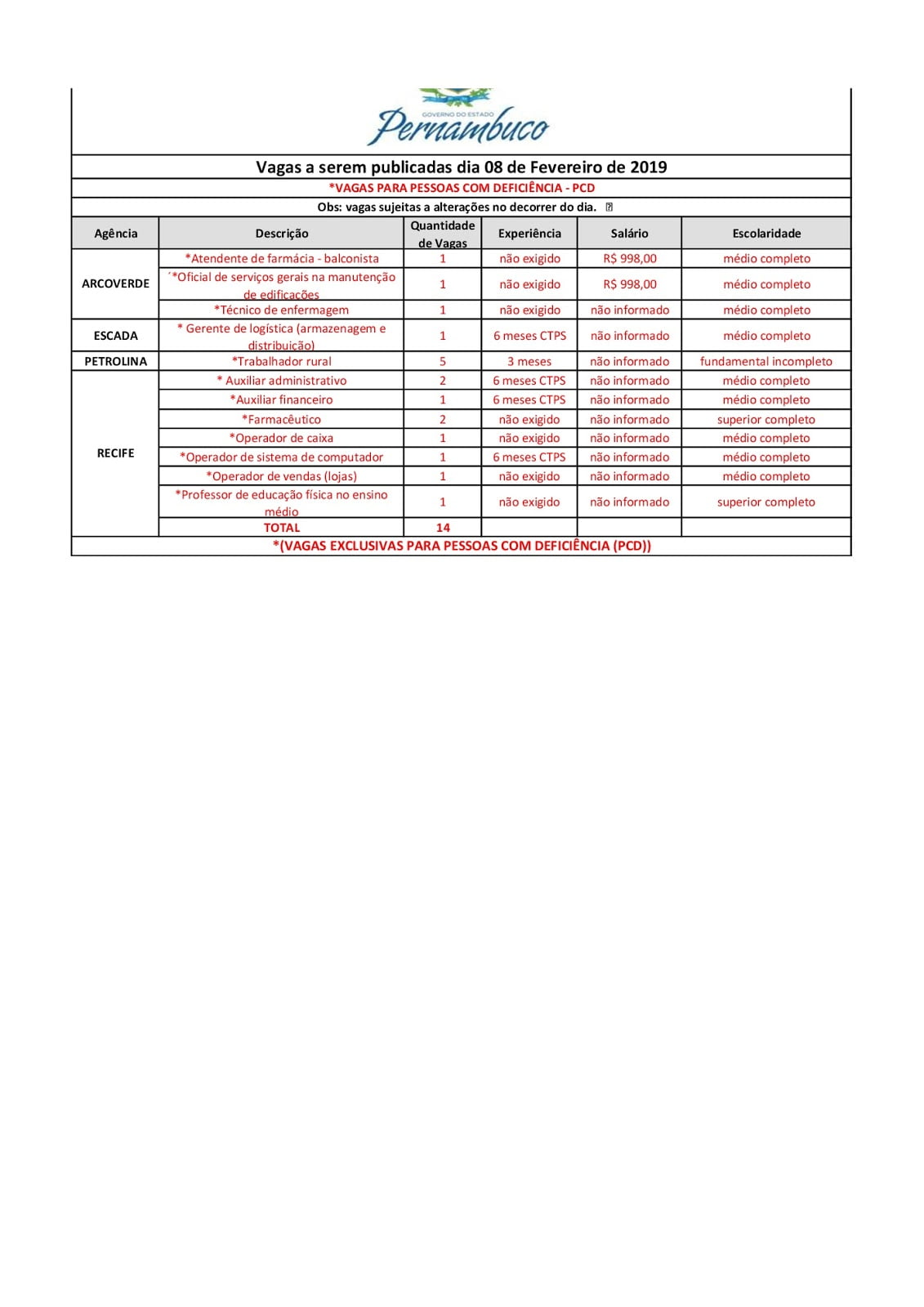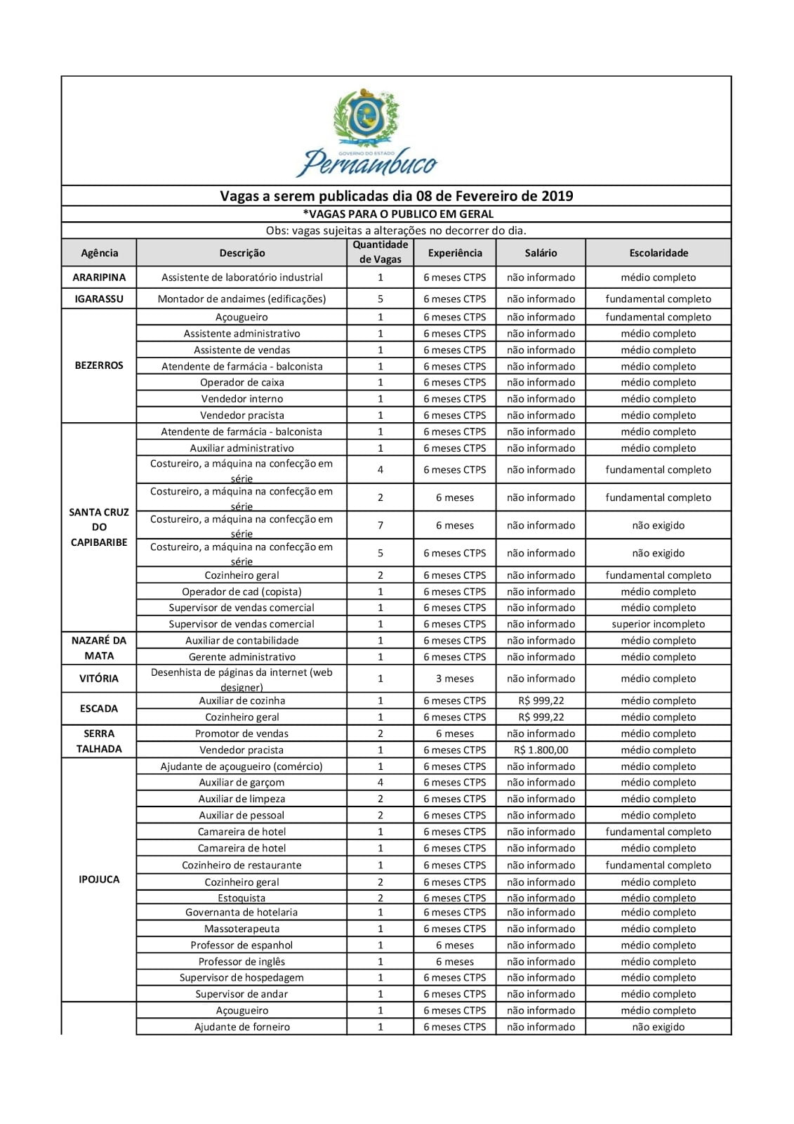 As Agências do Trabalho estão com vagas de emprego abertas para esta sexta-feira (08) em várias cidades de Pernambuco.