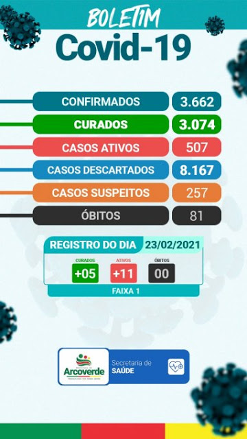 A Secretaria de Saúde de Arcoverde comunica nesta terça-feira, 23 de fevereiro, que até às 18 horas, foram contabilizados onze (11) novos casos de Covid-19 e cinco (05) curados. O boletim diário, portanto, fica com duzentos e cinquenta e sete (257) suspeitos, oito mil cento e sessenta e sete (8.167) descartados, três mil seiscentos e sessenta e dois (3.662) confirmados, oitenta e um (81) óbitos, e três mil e setenta e quatro (3.074) recuperados.