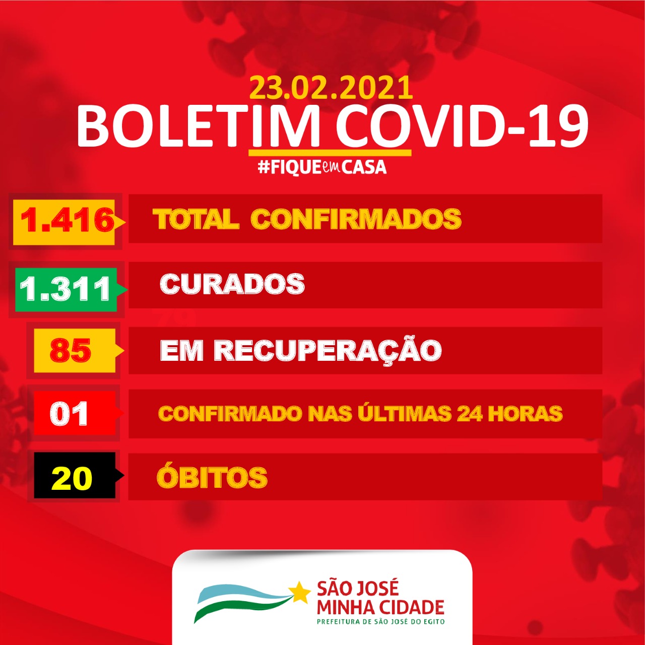 O município tem 176 casos em investigação, 31.541 descartados, 6.896 casos confirmados, 62 pacientes em isolamento domiciliar, 15 pacientes em internamento hospitalar, 77 casos ativos e 96 óbitos.
