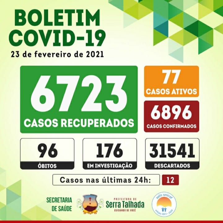 A Secretaria de Saúde de Serra Talhada informa no boletim epidemiológico desta terça-feira (23/02) que o município atingiu a marca dos 6.723 pacientes recuperados da Covid-19.