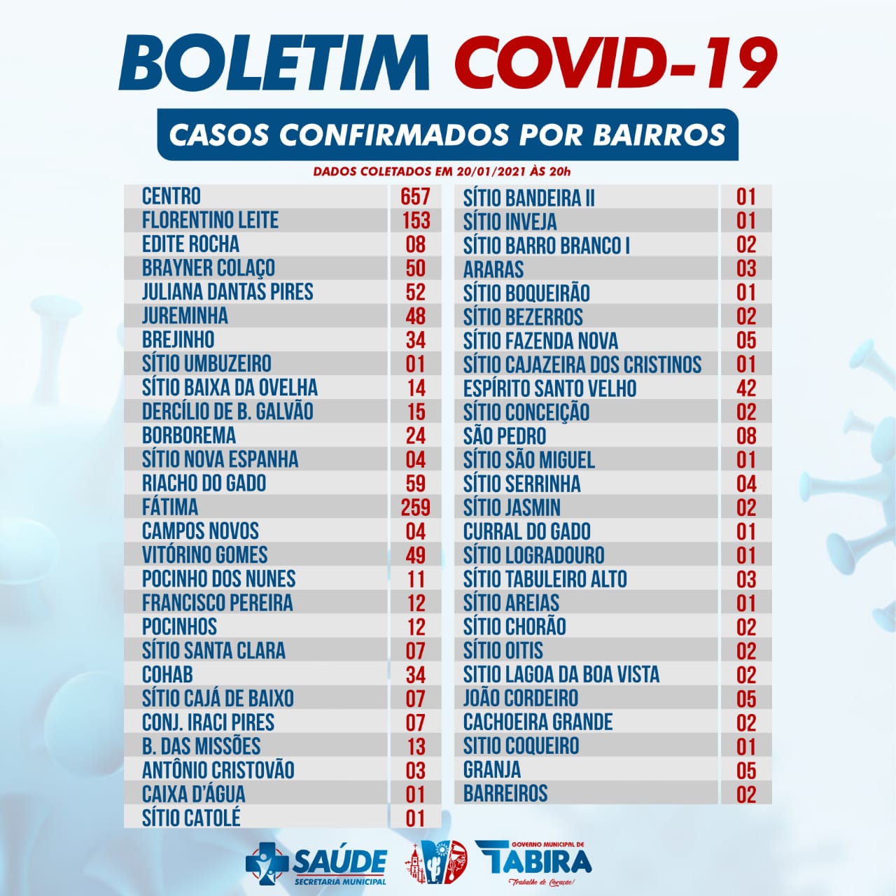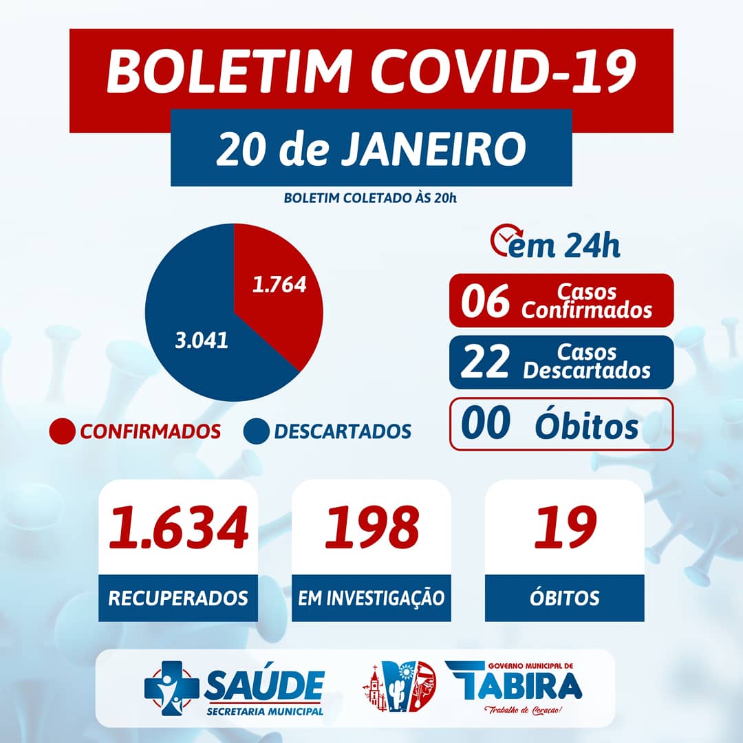 O município tem 343 casos em investigação, 27.436 descartados, 6.233 casos confirmados,     101 pacientes em isolamento domiciliar, 16 pacientes em internamento hospitalar, 117 casos ativos e 87 óbitos.