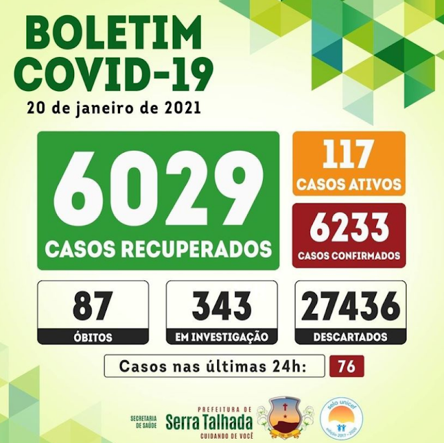 A Secretaria de Saúde de Serra Talhada informa no boletim epidemiológico desta quarta-feira (20/01) que o município atingiu a marca dos 6.029 pacientes recuperados da Covid-19.