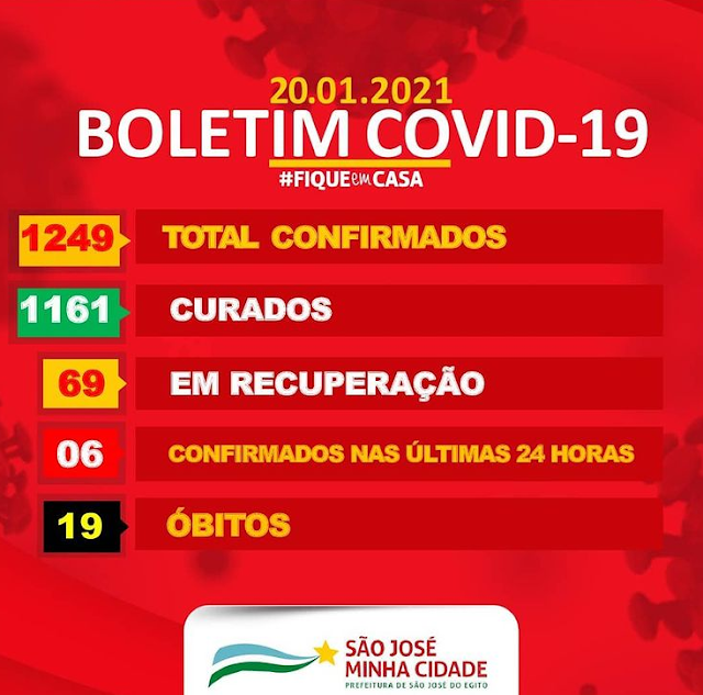 Nessa quarta-feira, nossas unidades de saúde 19 testes para detecção do novo coronavírus, já foram feitos 4.340 exames desse tipo em São José do Egito. Nas últimas 24hs, 13 pacientes finalizaram o tratamento, no momento, nosso município registra 1.161 pessoas curadas da covid-19. Tivemos a confirmação de 6 novos casos da doença. Atualmente, nossa equipe multidisciplinar segue acompanhando 69 pessoas que testaram positivo para o vírus e estão cumprindo isolamento domiciliar.