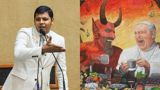 O deputado estadual Diego Castro (PL) entrou com uma representação junto ao Ministério Público Federal (MPF), nesta quinta-feira (12), após a viralização de uma pintura na parede da Faculdade de Comunicação da Universidade Federal da Bahia (Facom/UFBA), que retrata o Papa Francisco ao lado de uma figura que simboliza o diabo.