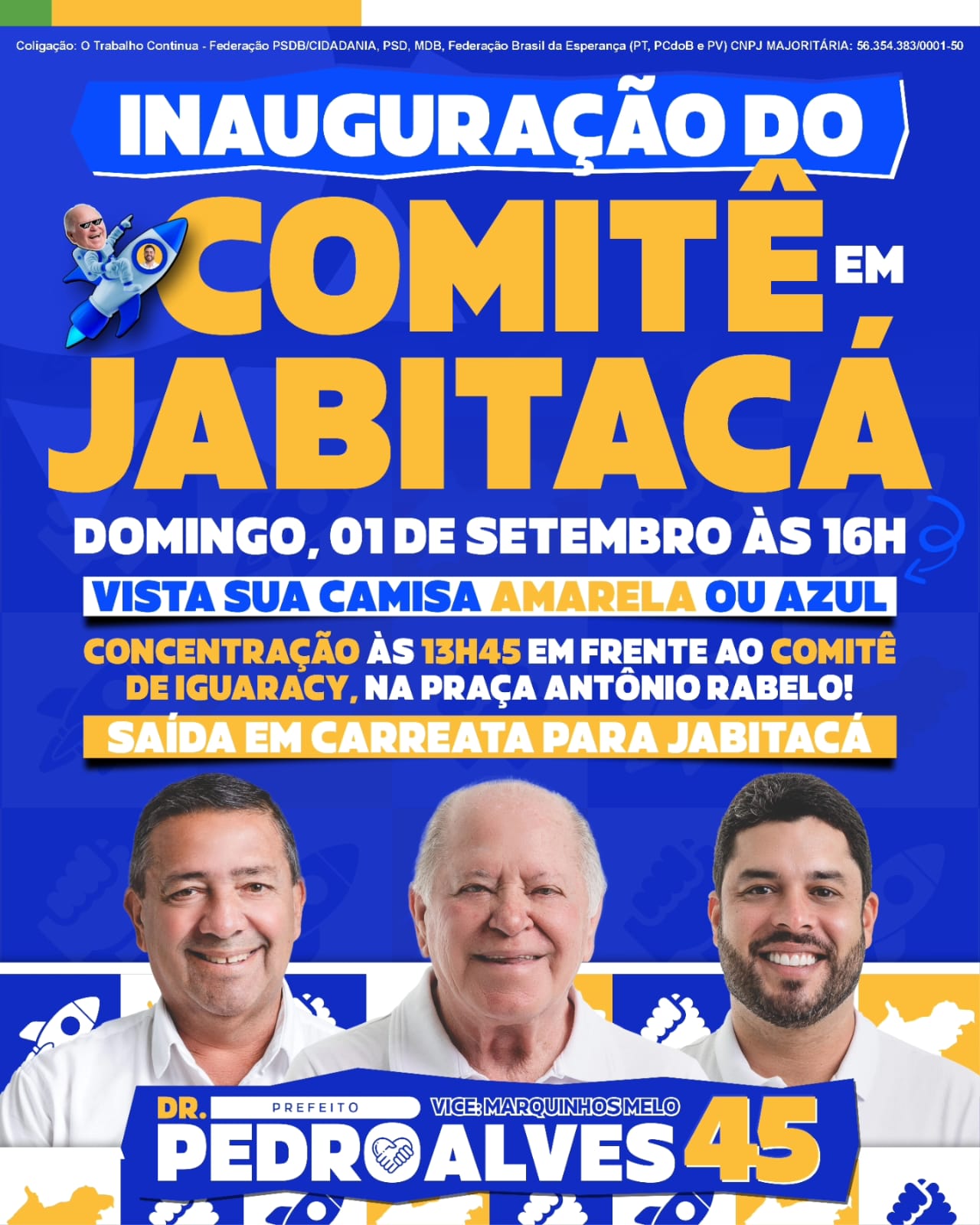 A concentração para a carreata terá início às 13h45 em frente ao comitê de Iguaracy na praça Antônio Rabelo, de onde os participantes seguirão juntos em um ato de apoio e união em prol da candidatura. Para entrar no clima da festa, todos são convidados a vestir suas camisas amarela ou azul, cores que representam a campanha.