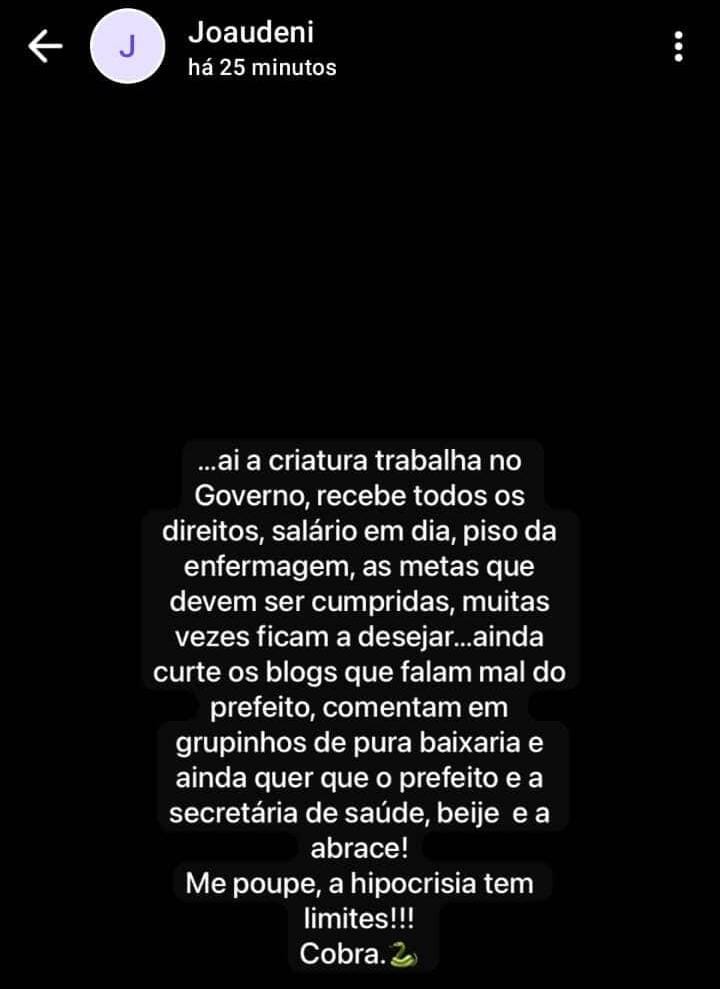 Na publicação, a secretária afirma que a servidora recebe “todos os direitos” — como se isso não fosse uma obrigação legal — e ainda a chama de “cobra”, sugerindo uma clara postura de perseguição política e pessoal.