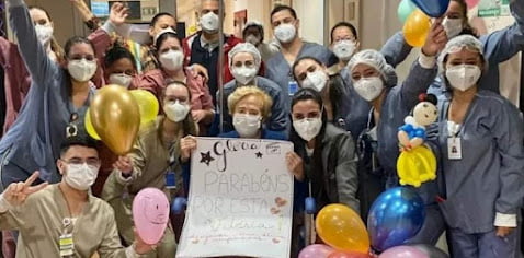 Em imagens divulgadas pela nora, a publicitária Mocita Fagundes, Glória aparece em uma cadeira de rodas, cercada por balões e pelos profissionais de saúde que cuidaram de sua recuperação. Ela recebe um cartaz que diz: “Parabéns por esta vitória”.