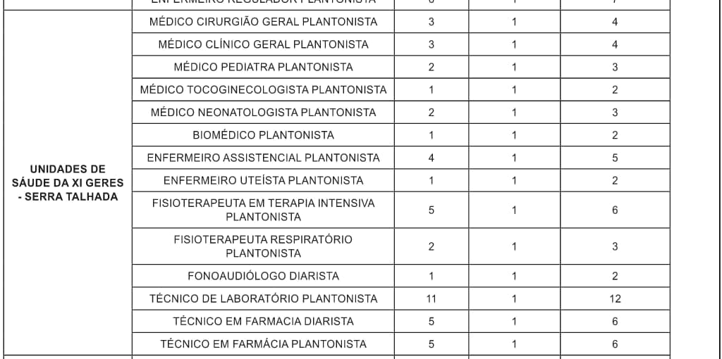 Também há vagas disponíveis para assistente social, biomédico, enfermeiro (assistencial, obstetra, uteísta e regulador), engenheiro de segurança do trabalho, farmacêutico, fisioterapeuta (em terapia intensiva e respiratório), fonoaudiólogo, nutricionista, psicólogo, terapeuta ocupacional, entre as profissões de nível superior; e técnicos de enfermagem, laboratório e farmácia, entre os de nível técnico.