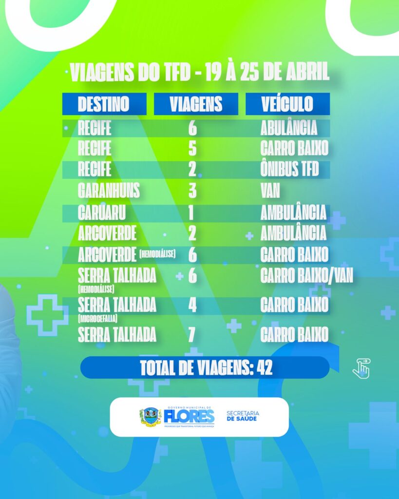 O suporte aos pacientes que precisam de tratamento em outras cidades também é prioridade. O programa de Tratamento Fora do Domicílio (TFD) contabilizou 42 viagens no período, utilizando ambulâncias, ônibus e veículos leves para destinos como Recife, Garanhuns, Caruaru, Arcoverde e Serra Talhada.