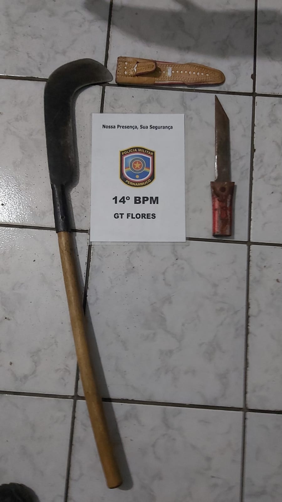 Após as ameaças o envolvido teria se evadido do local, que após diligências o mesmo foi localizado portando uma faca peixeira tipo “chuncho” na cintura, como também, localizaram a referida foice citada anteriormente.