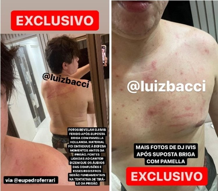 Imagens do DJ ferido: Neste fim de semana, o jornalista Luiz Bacci, apresentador da Record, divulgou imagens do músico ferido após uma suposta briga com Pamella, no dia 12 de março, no apartamento do agora ex-casal. Ao colunista Léo Dias, a ex-mulher dele relatou que nunca viu o produtor como ele aparece nas fotos, ela revelou que já entrou com pedido de apreensão do celular do produtor.