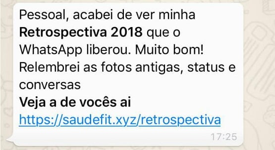 De acordo com a PF, está sendo compartilhada uma mensagem que promete mostrar uma retrospectiva do ano de 2018 no WhatsApp. O recurso funcionaria como uma memória capaz de relembrar atividades como, por exemplo, fotos enviadas, status e conversas. No entanto, a ação é uma armadilha para atrair as pessoas a acessarem um link e, assim, fazer com que alguém lucre com o número de cliques a partir de anúncios na página.