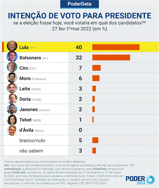 O ex-presidente Luiz Inácio Lula da Silva (PT) tem 40% das intenções de voto em 1º turno para a Presidência da República contra 32% do atual ocupante da cadeira, Jair Bolsonaro (PL). O dado foi revelado por pesquisa PoderData realizada de 27 de fevereiro a 1º de março de 2022.