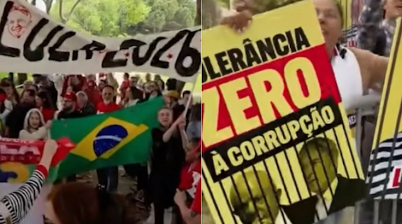 Grupos de brasileiros e portugueses se reuniram nesta terça-feira (21), nas proximidades do Palácio de Belém, em Lisboa, para manifestos pela presença do presidente Lula, que está em visita ao país europeu.