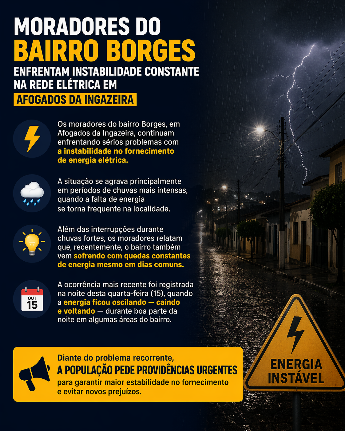 Além das interrupções durante chuvas fortes, os moradores relatam que, recentemente, o bairro também vem sofrendo com quedas constantes de energia mesmo em dias comuns. A instabilidade tem causado transtornos e preocupação para quem vive na região.