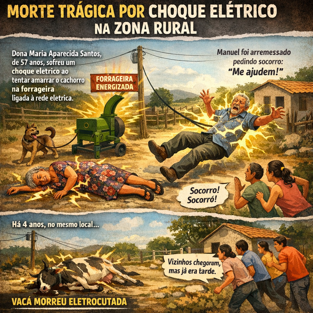 O acidente teria acontecido no momento em que dona Maria tentou amarrar o cachorro do casal no corpo de uma forrageira que estava ligada à rede elétrica. A máquina vazou corrente e ela tomou o choque, morrendo no local.