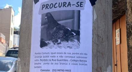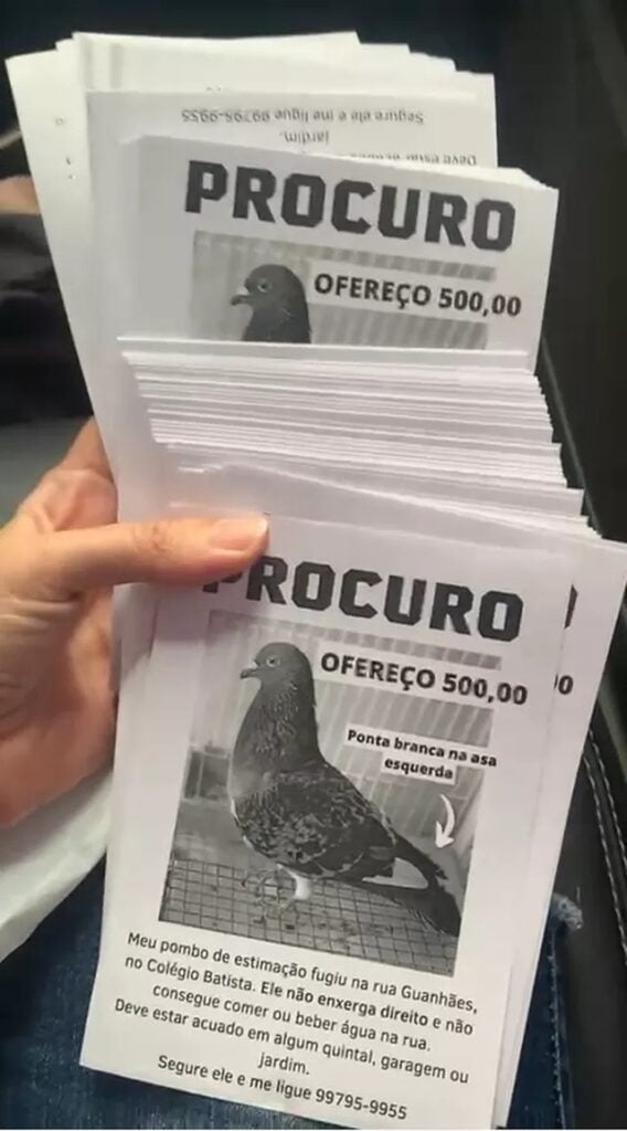 No panfleto que ela está distribuindo, Brena informou que o Pombo não enxerga direito, além de não conseguir comer ou beber água na rua. Ainda no papel, ela explica que a ave tem uma ponta branca na asa esquerda. Essa é a primeira vez que o pombo fugiu e que pode está acuado em algum quintal ou garagem das redondezas.