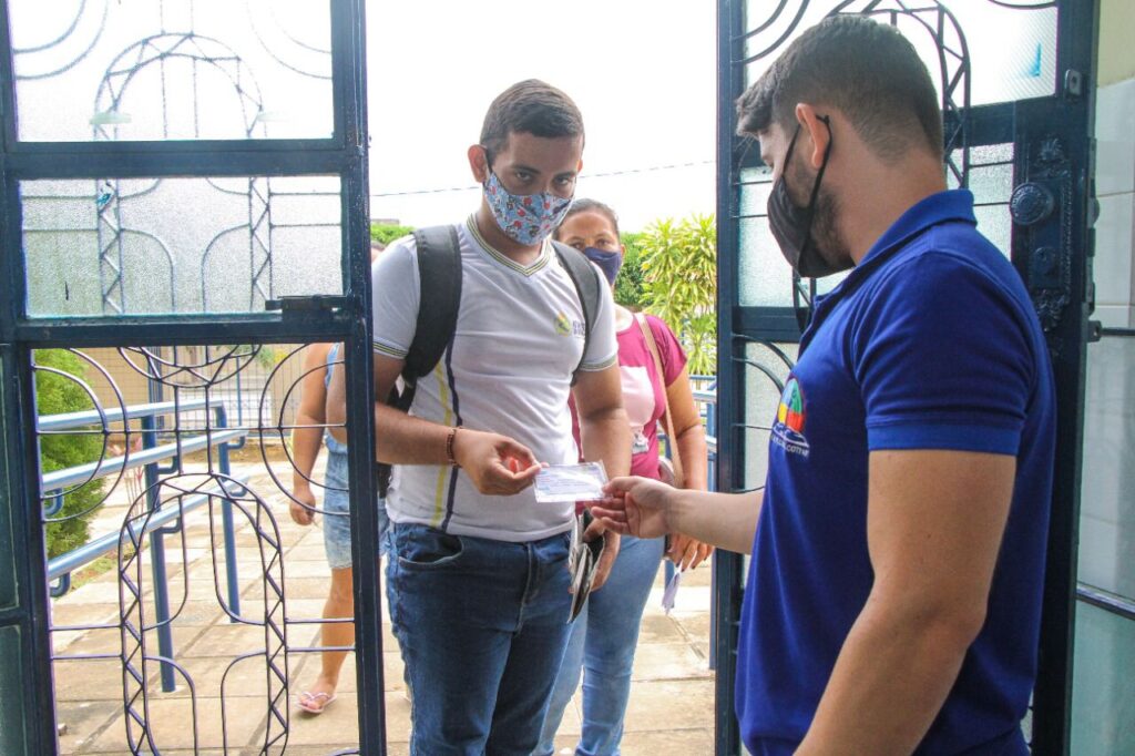 Os estudantes, muitos deles acompanhados pelos pais ou responsáveis, fizeram questão de mostrar que já estão devidamente vacinados. Eles foram recebidos pelos profissionais da educação em festa com a retomada das aulas.