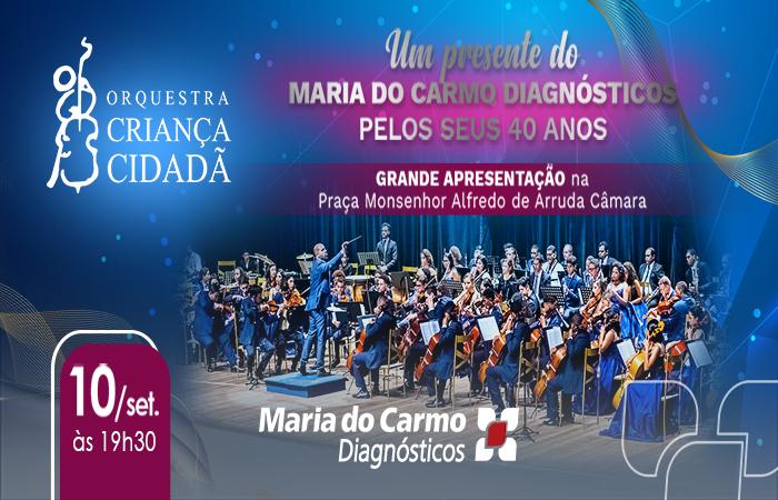 A Orquestra Criança Cidadã fará um grande concerto ao ar livre no dia 10 de setembro, a partir das 19h30, na Praça Monsenhor Arruda Câmara, no centro de Afogados da Ingazeira, para celebrar os 40 anos do Maria do Carmo Diagnósticos. Sob a regência do maestro titular da orquestra, José Renato Accioly, será a primeira vez que a orquestra se apresenta no Vale do Pajeú. Em outubro de 2014, a Orquestra Criança Cidadã encantou o Papa Francisco ao se apresentar no Vaticano, Itália.